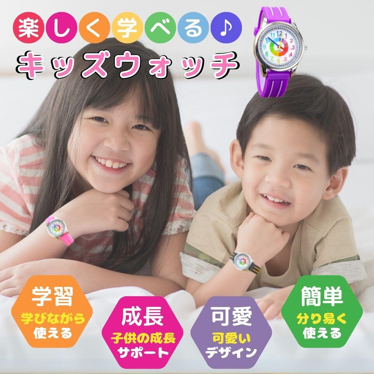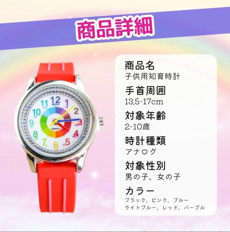選べる6色 おしゃれで可愛いキッズ用知育腕時計!2~10歳まで長く使えるアナログ時計で、時間の学習をサポート 見やすい文字盤と防水仕様で、毎日の遊びやお出かけにも安心。 耐久性抜群だから、兄弟・姉妹でおそろいにもぴったり! 誕生日や入学祝い、卒園記念品にもおすすめのプレゼントです。