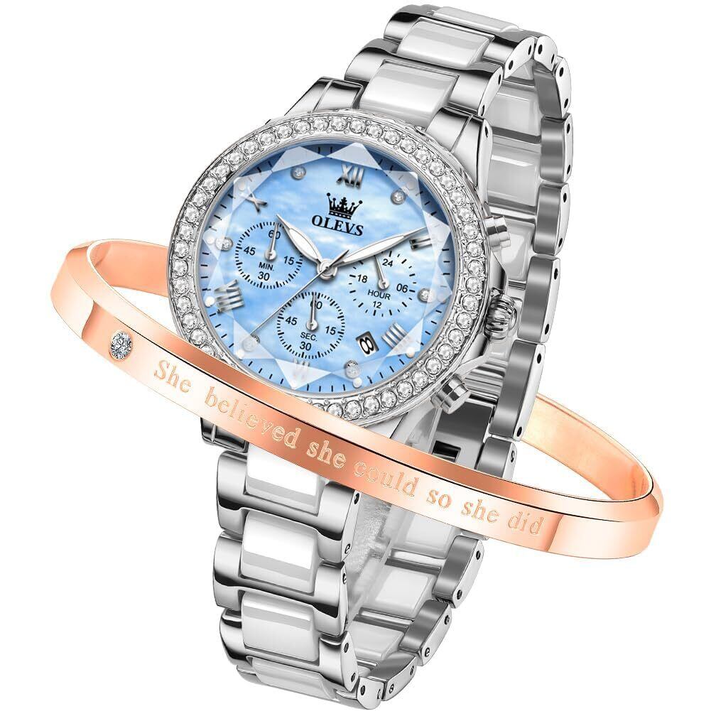 【特価商品】OLEVS 腕時計 レディース セラミック かわいい クオーツ 人気腕時計 女性 エレガント おしゃれ 日付 防水 夜光 Watch for women ブルー