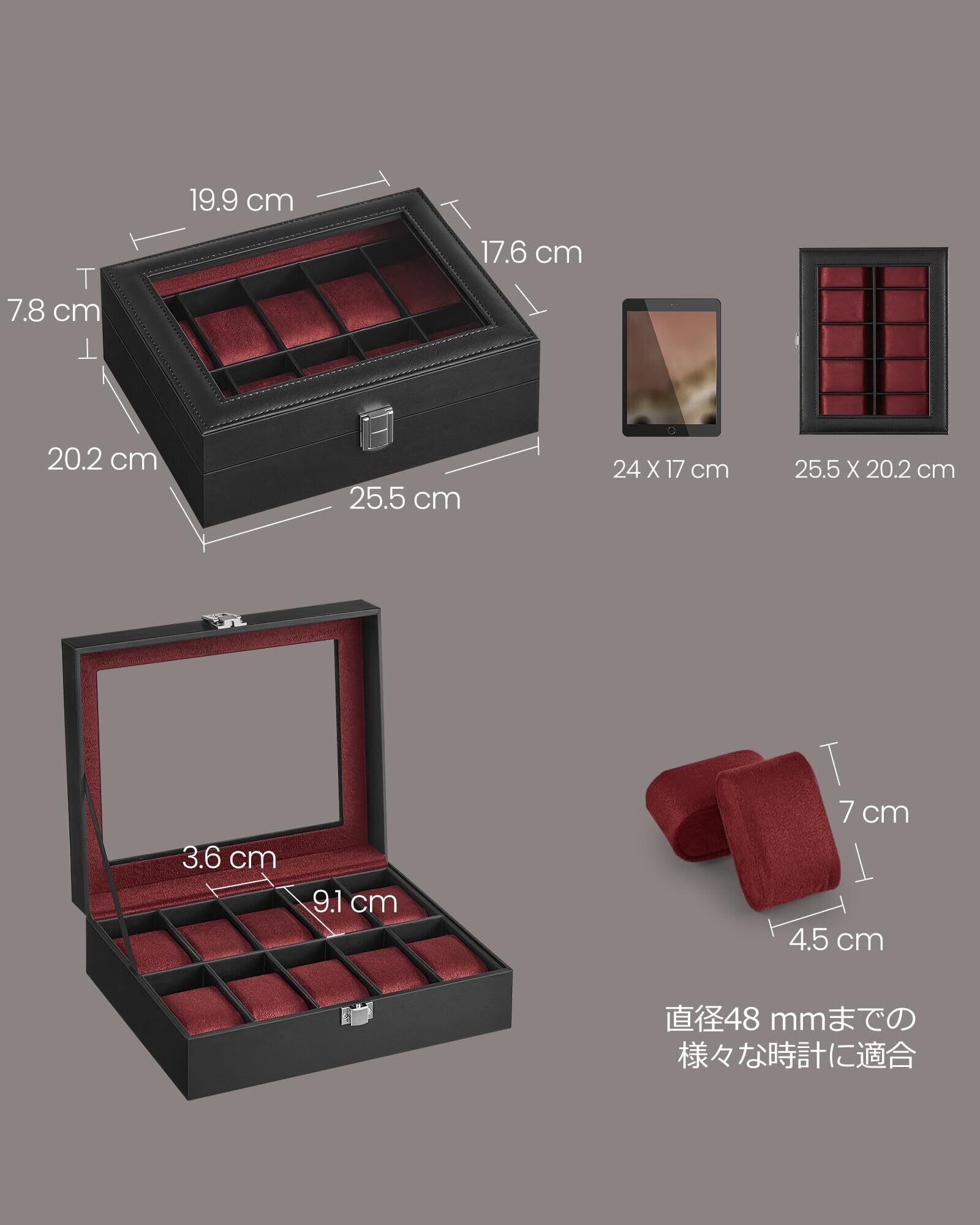 【セット内容】10本収納のクラシックな腕時計ボックス、ジュエリー収納にも使える取り外し可能なクッション、そしてほこりから時計を守るガラス蓋付き。