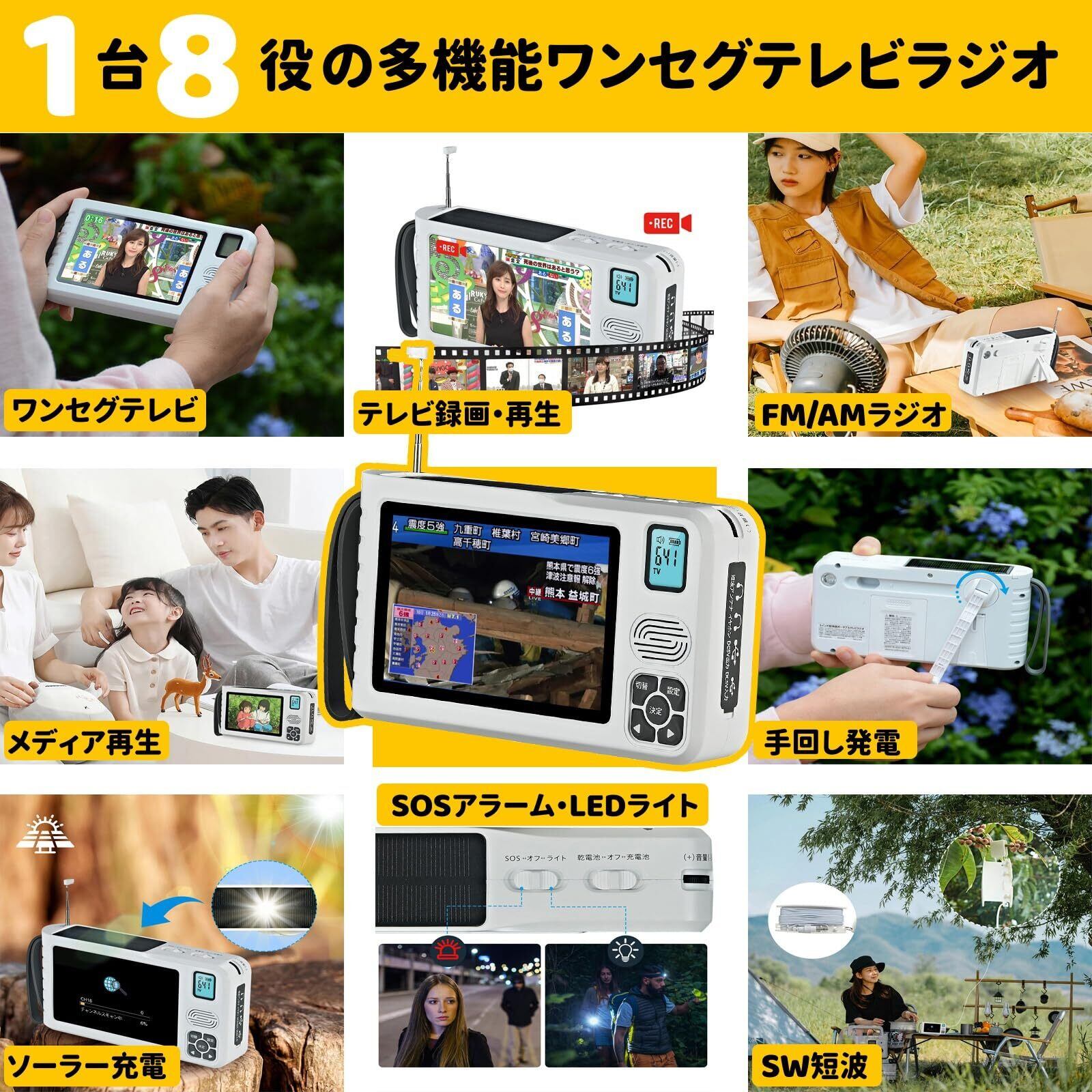【5インチ ワンセグテレビ 】●日本デザイナー設計した2026年の新モデルとなり、5インチ液晶パネルを搭載されて ワンセグテレビ となります。気になる番組・ニュースなどを見逃せないです。TVをみながら家事をしたり、屋外の作業をしたりと普段使いにも便利! もちろん停電や災害火事にもつかえるのでもしもの時にも最新の状況を映像で確認できるので、心が静かになります!● ワンセグTV 受信周波数範囲:(UHF 470~770MHz/13~62ch)
