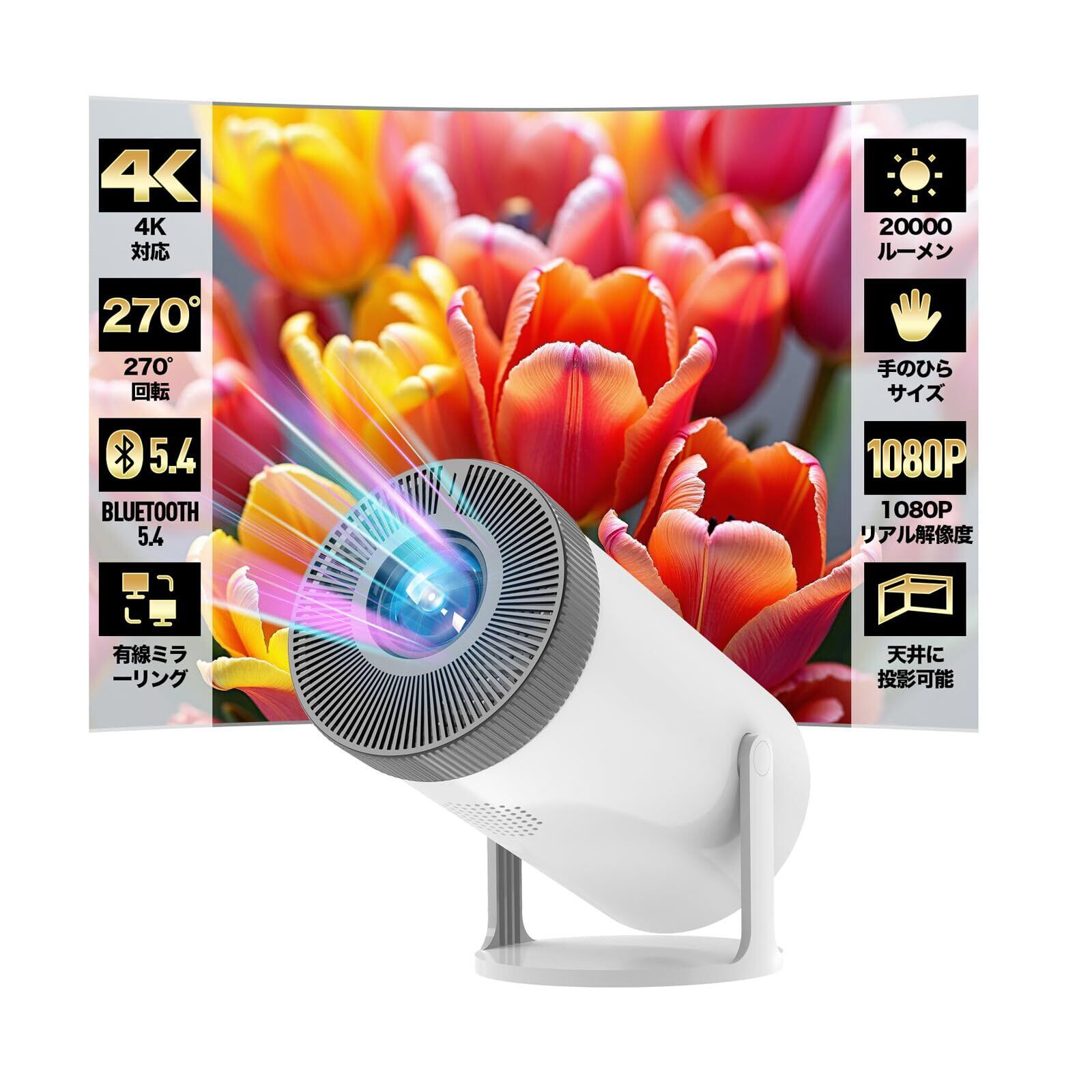 【革新的な270°回転・スタンド一体型】従来のプロジェクターと異なり、プロジェクターは270度回転可能なスタンドを搭載しているため、スタンドを追加購入する必要はありません。投影角度を自由に調整し、ご自宅の壁や天井に投影することができます。卓上やベッドなどにそのまま置くができ、正面だけでなく天井などにも投影でき、寝転びながらでもコンテンツを楽しめます。設置場所に制限がなく、本当に自由な投影を実現します!