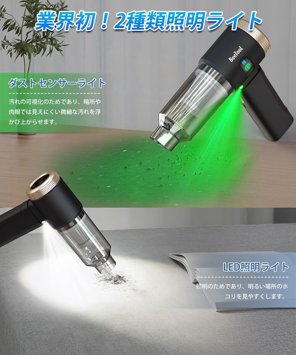 【業界初!2種類の照明ライトを搭載!】BeeToolのハンディクリーナー「ZX-208」は、シーンに応じて使い分けられる2種類のライトを業界初導入! LED白色ライト:暗い環境(夜間・車庫・シート下など)で十分な明かりを提供。隅々まで見逃さず、確実な清掃をサポート。 緑色ダストセンサーライト:人間の目には最も比視感度に近い高輝度緑色光ライトを搭載して、見えないホコリを可視化!視認性が抜群で、暗い部屋でも微小ゴミは見やすくなりました!正確に照射角度を調整した光が、明るくても目に見えないホコリを浮かび上がらせて、吸い取ります。