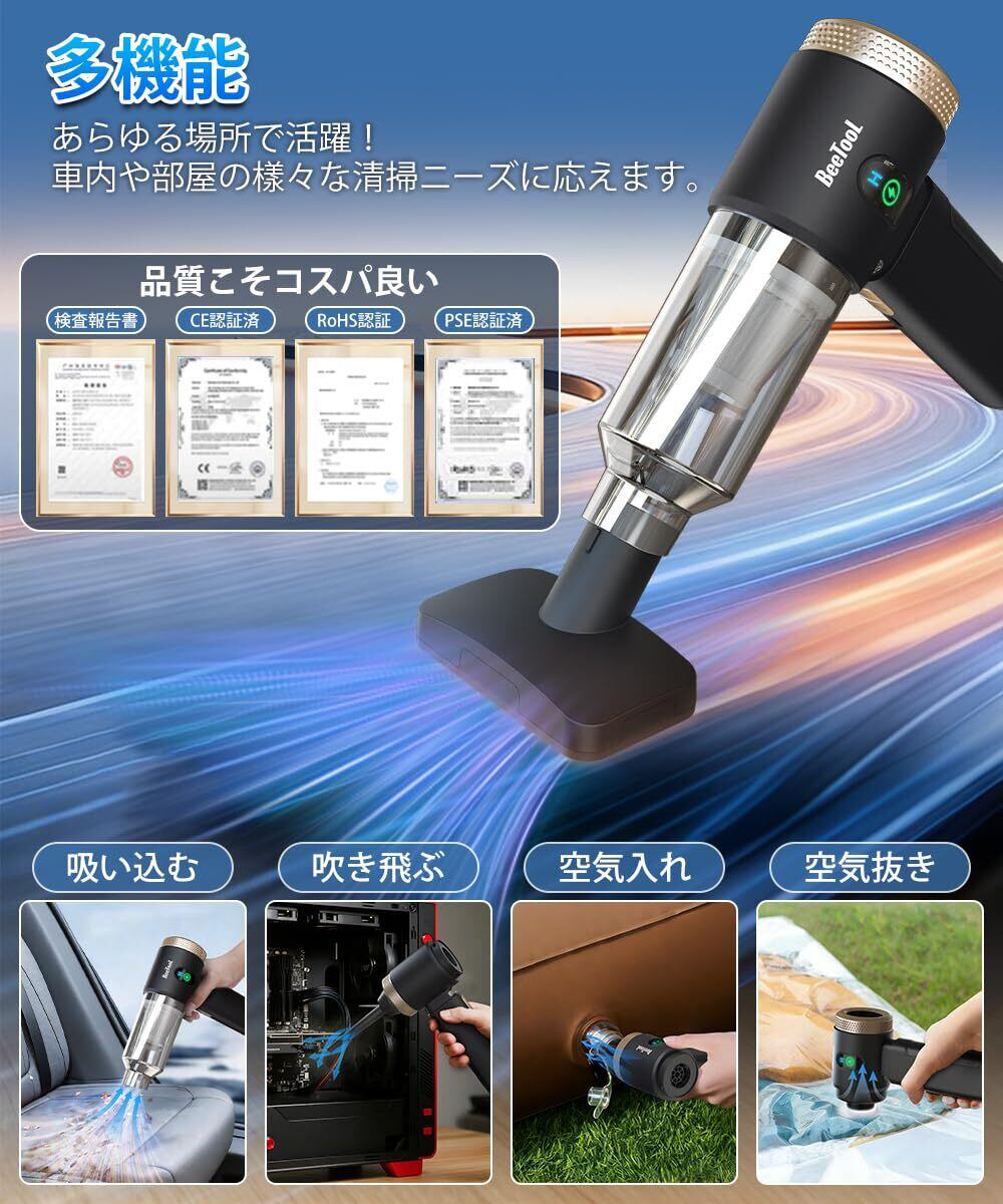 業界初! ハンディクリーナー 40000Pa 強力吸引力 BeeTool ハンディ掃除機 多機能 小型掃除機 6000mAh大容量バッテリー 長時間稼働 コードレス 吹き飛ぶ/吸い込む/空気入れ/空気抜き 軽量 乾湿両用 Type-C充電式 メーカー付 人気 業務用/車用清掃/家具/家庭用 ZX-208(ブラック)