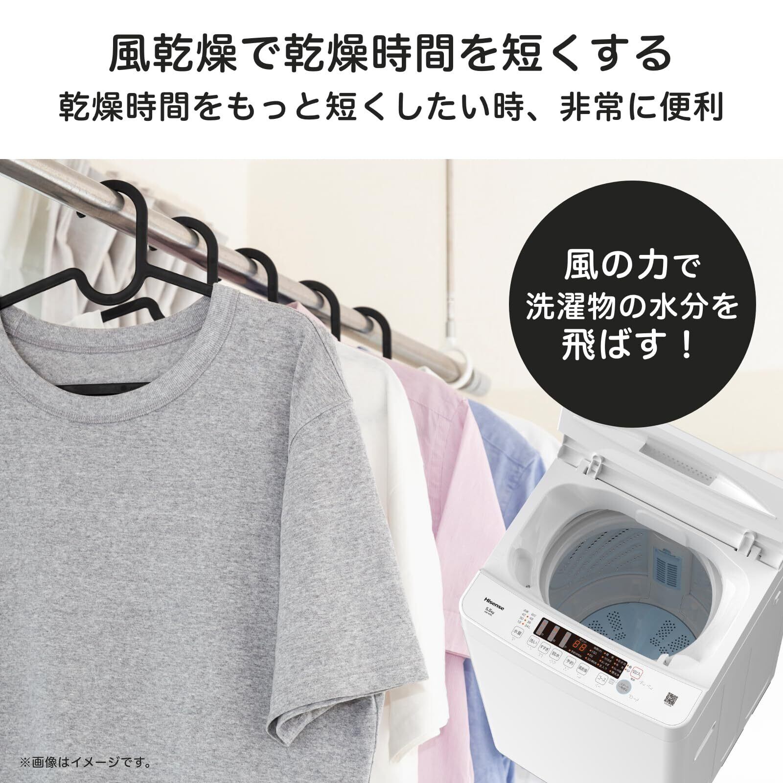 衣類の水分を風で飛ばし、部屋干しの時間を短縮。
