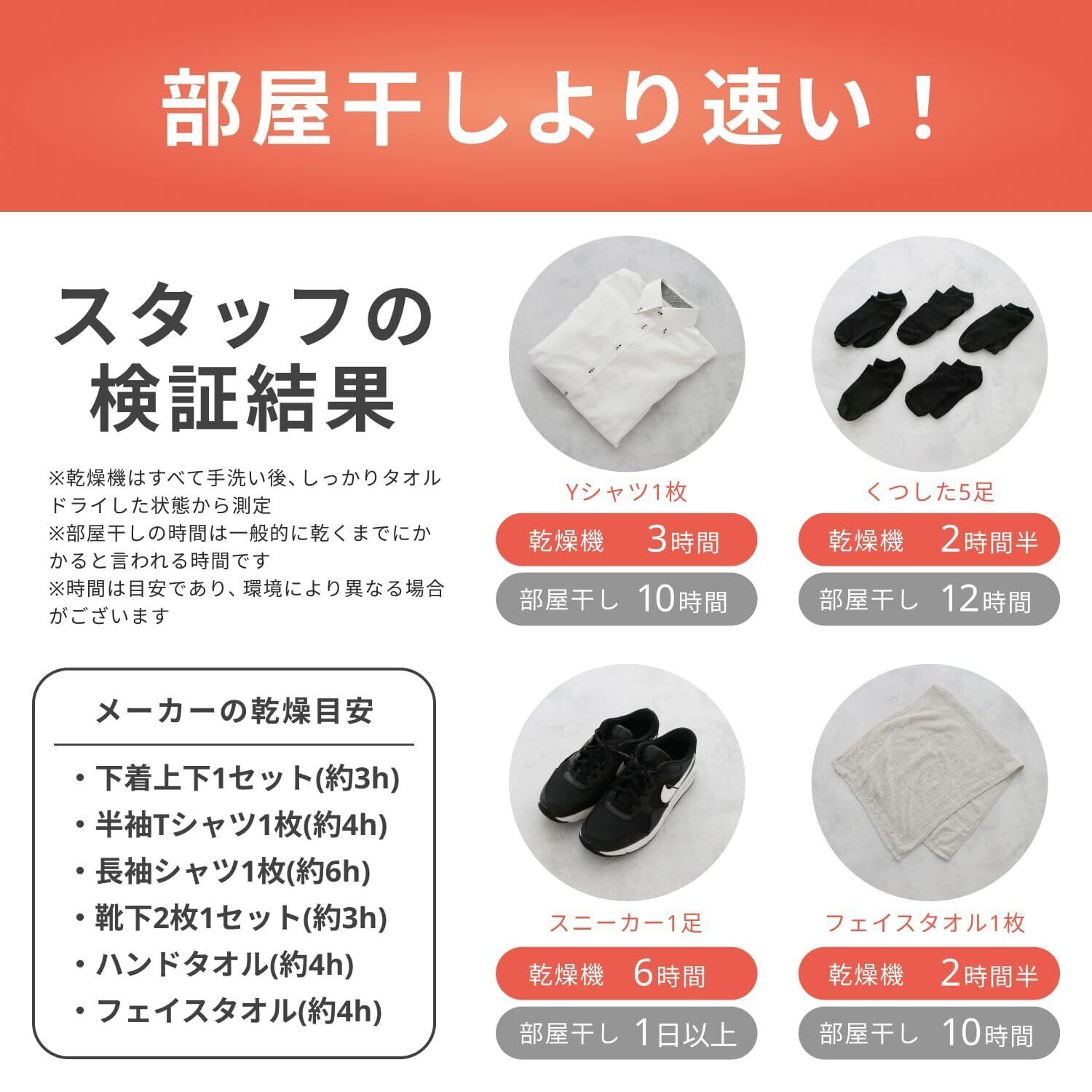 【静音&省エネ】電気代は1時間あたり約4円※とおサイフにやさしく、頻繁に使ってもドラム式洗濯乾燥機や浴室乾燥より電気代を抑えやすいのが魅力です。生乾き臭の対策にも有効で、シーズンを問わず、旅行に限らず、冬の乾きにくい時期や梅雨時期、雨の日にも活躍できます。※電気代は目安です。使用環境・設定等により異なります。 夜間でも使いやすい静音設計。動作音は約35.6dBと、深夜の郊外や図書館レベルの動作音です。寝ている時も気になりにくい静かな動作音です。自動タイマー搭載で、1時間・3時間・6時間の3種類で自動オフになるよう設定できます。例えば、就寝前に靴下をセットして3時間以上動作させ、朝には乾燥完了!という使い方も可能です。