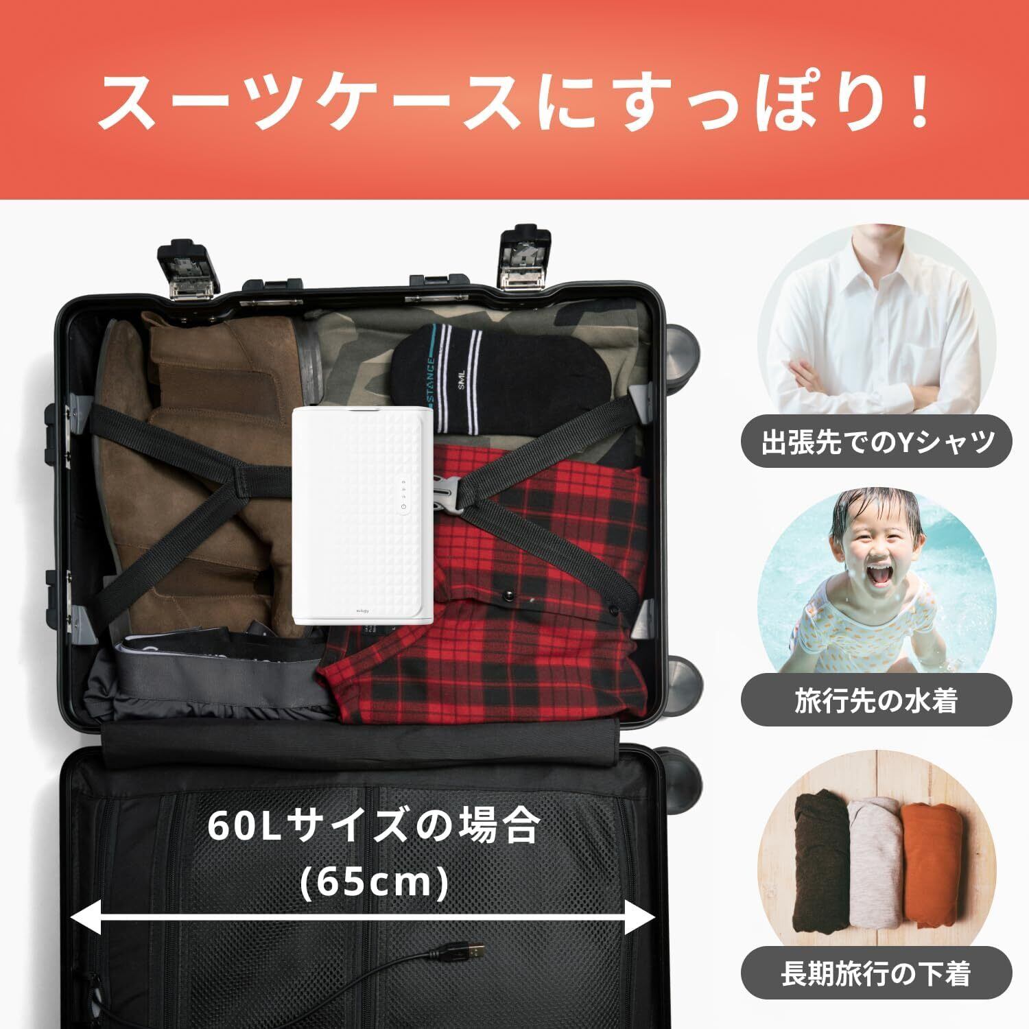 【海外でも使える】海外出張や旅行先のホテルでも大活躍。コインランドリー待ちや浴室乾燥が使えない場面でも、手洗い後の小物をスピーディに乾かせます。コンパクト&置き型なので設置場所を選びにくく、物干し竿が無い部屋でロープをくくり付けるなどの大変な場所確保は不要です。ベッドサイドやデスク横でも使いやすい。長期の旅や留学、スポーツ遠征など、持っていけば安心な旅ガジェットです。※ご注意:各国のコンセント形状に合わせた変換プラグ(アダプター)をご用意ください。当商品には付属しておりません。