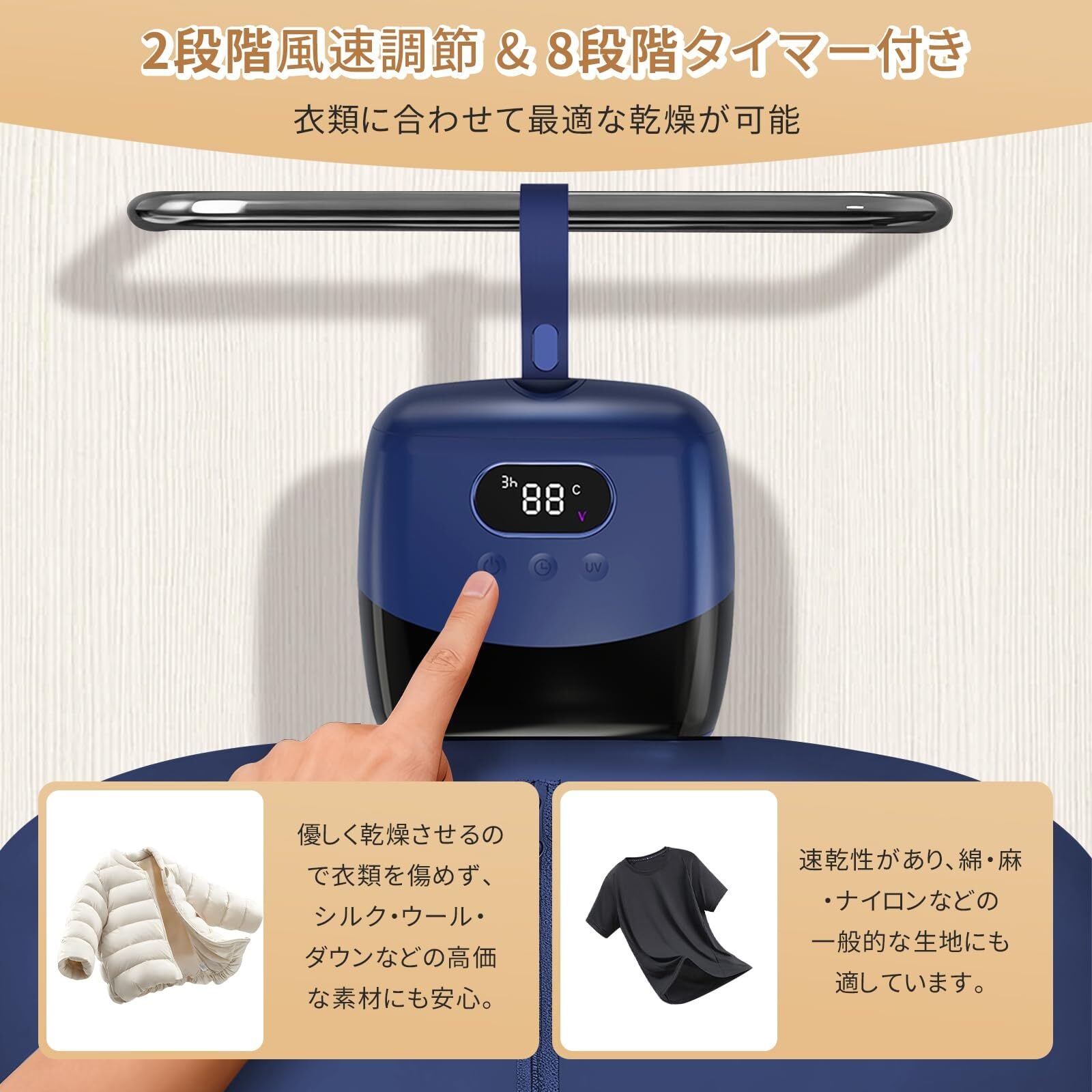 【2段階乾燥モード&タイマー調整で衣類を守る】75℃と85℃の2段階温度調整に加え、8段階のタイマー設定が可能です。麻や綿など厚手の素材は85℃でしっかり速乾、デリケートなシルクやウールは75℃で優しくドライ。タイマーで乾燥時間を細かく調整でき、衣類のダメージを防ぎながら、効率的な乾燥を実現します。小型衣類乾燥機として衣類の傷みを防ぎながら最適な乾燥をサポートします。