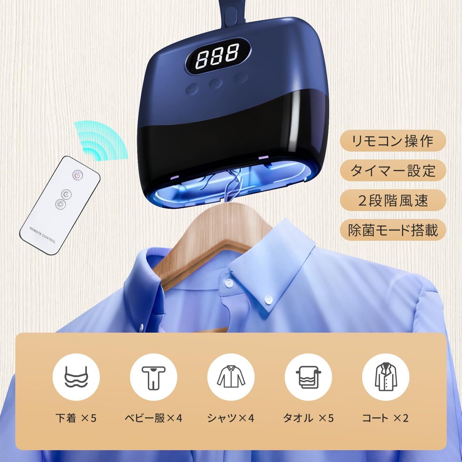 衣類乾燥機ポータブル 省スペース 電源コード式 小型 リモコン付き 2段階温度 8段階タイマー 小型軽量 工事不要 生乾き防止 ホテル 旅行 出張 一人暮らし