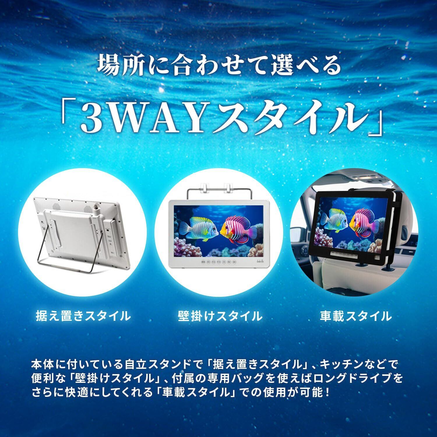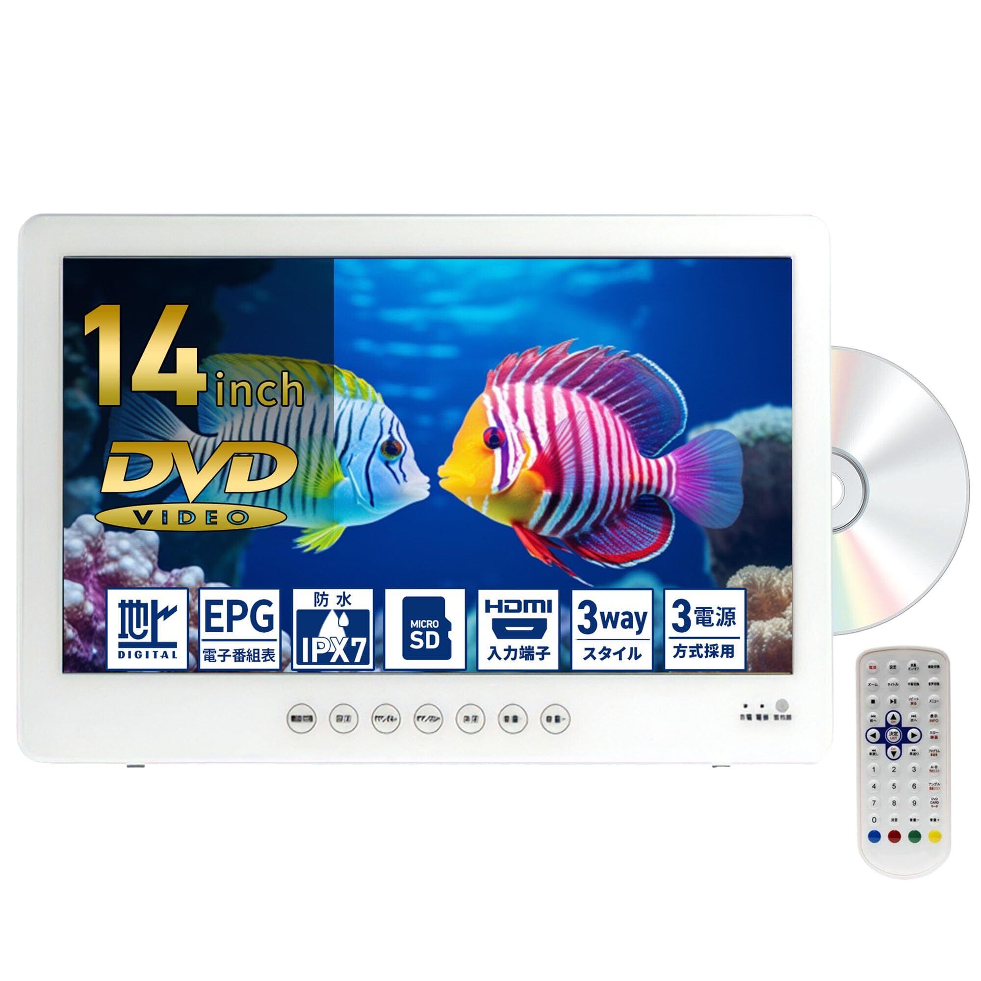 14インチ 防水テレビ ポータブルDVDプレーヤー搭載 地デジ対応 車載バッグ付き ホワイト ワンセグ リージョン オール 充電 地デジ フリー 液晶 スクリーン 大容量充電バッテリー 車 10 12 14 o000