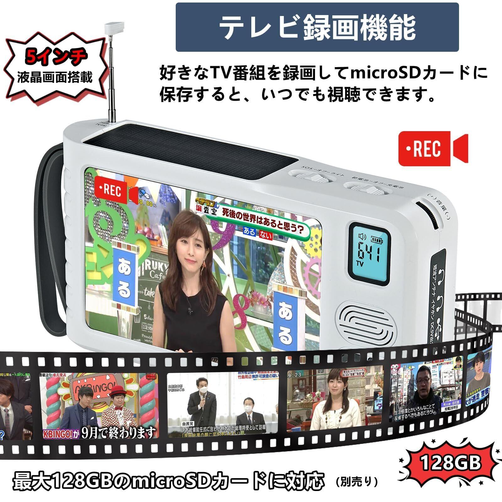 【microSDカード再生機能・LEDライト・モバイルバッテリー・SOSサイレン】●最大128GBのmicroSDカード(別売り)に対応し、カードに保存されている動画や音楽、画像を再生可能です。●ポータブルテレビ・ラジオとして使える以外、暗い場所や停電時に便利なLEDライトも搭載しています。●SOSサイレン機能が付いており、いざという時にサイレンを通じて自分の居場所を知らせて他人に助けてもらえます。●内蔵充電池または乾電池の2WAYから、スマホやiPhoneを充電できるので、緊急時にモバイルバッテリーとしても活躍します。