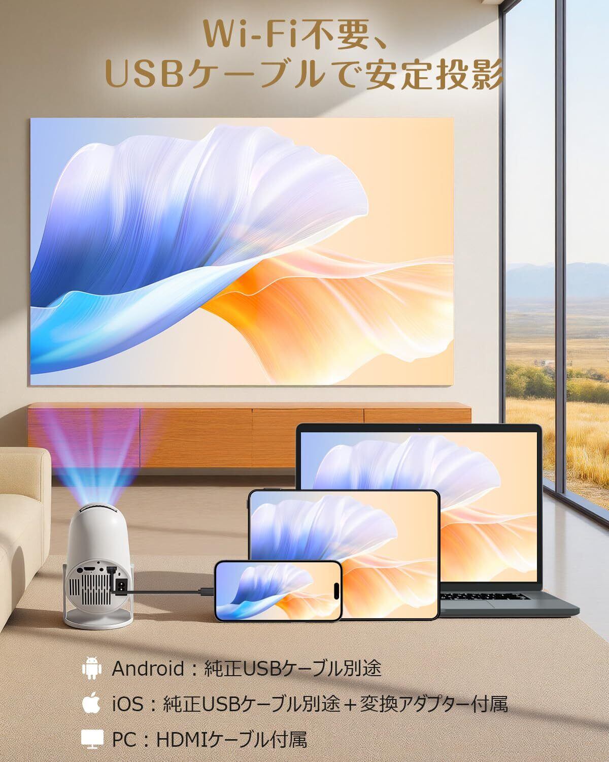 【有線ミラーリング・スマートプロジェクター】プロジェクターには純正のUSBケーブルでお気に入りの映画やテレビ番組を視聴することができます。 Fire TV Stickを使用して8,000以上のアプリで50万本以上の映画やテレビエピソードを楽しむことができ、Prime Video、YouTube、Netflixなどの様々な映画やビデオを大画面で楽しむことができます。さらに、要件に応じて Google PlayストアやApp Store から大量のアプリをダウンロードできます。、(ご注意: Fire TV Stickを別途購入してください。)