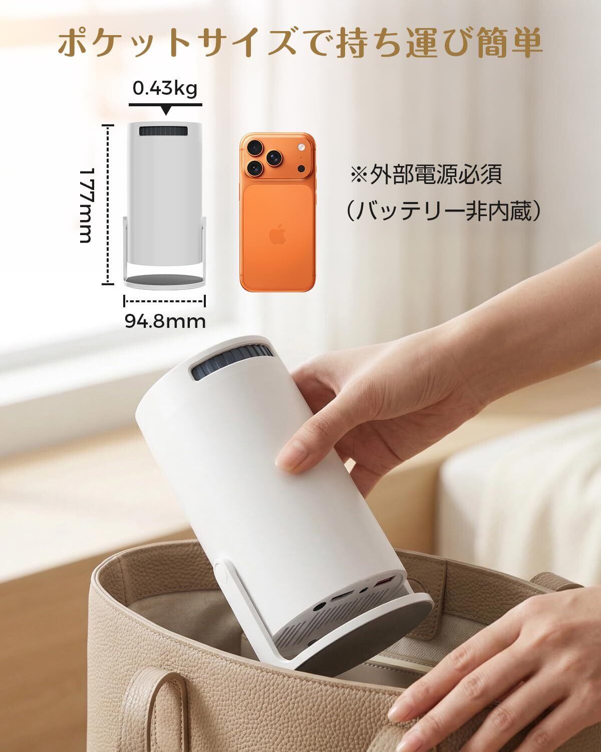 【革新的な270°回転・スタンド一体型】従来のプロジェクターと異なり、プロジェクターは270度回転可能なスタンドを搭載しているため、スタンドを追加購入する必要はありません。投影角度を自由に調整し、ご自宅の壁や天井に投影することができます。卓上やベッドなどにそのまま置くができ、正面だけでなく天井などにも投影でき、寝転びながらでもコンテンツを楽しめます。設置場所に制限がなく、本当に自由な投影を実現します!