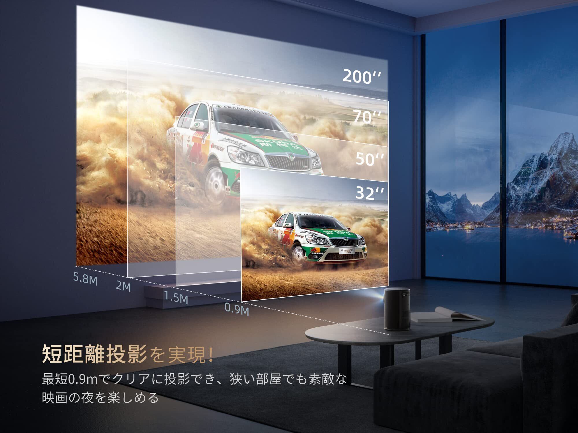 ③【0.9m短焦点×天吊り投影|「巣ごもり正月」を格上げ】 日本の住宅事情に合わせた0.9m短焦点モデル。ベッドサイドやこたつテーブルなど、限られた距離でも大画面を実現します。さらに底部1/4インチネジ穴付きで、市販の三脚はもちろん、照明用ダクトレール(ライティングレール)への吊り下げ設置や、天井への固定が驚くほど簡単に。本体を動かさず画面サイズを縮小できる50%ズームも搭載。寒い冬は温かい布団から出ずに、至福のリラックスタイムをお過ごしください。