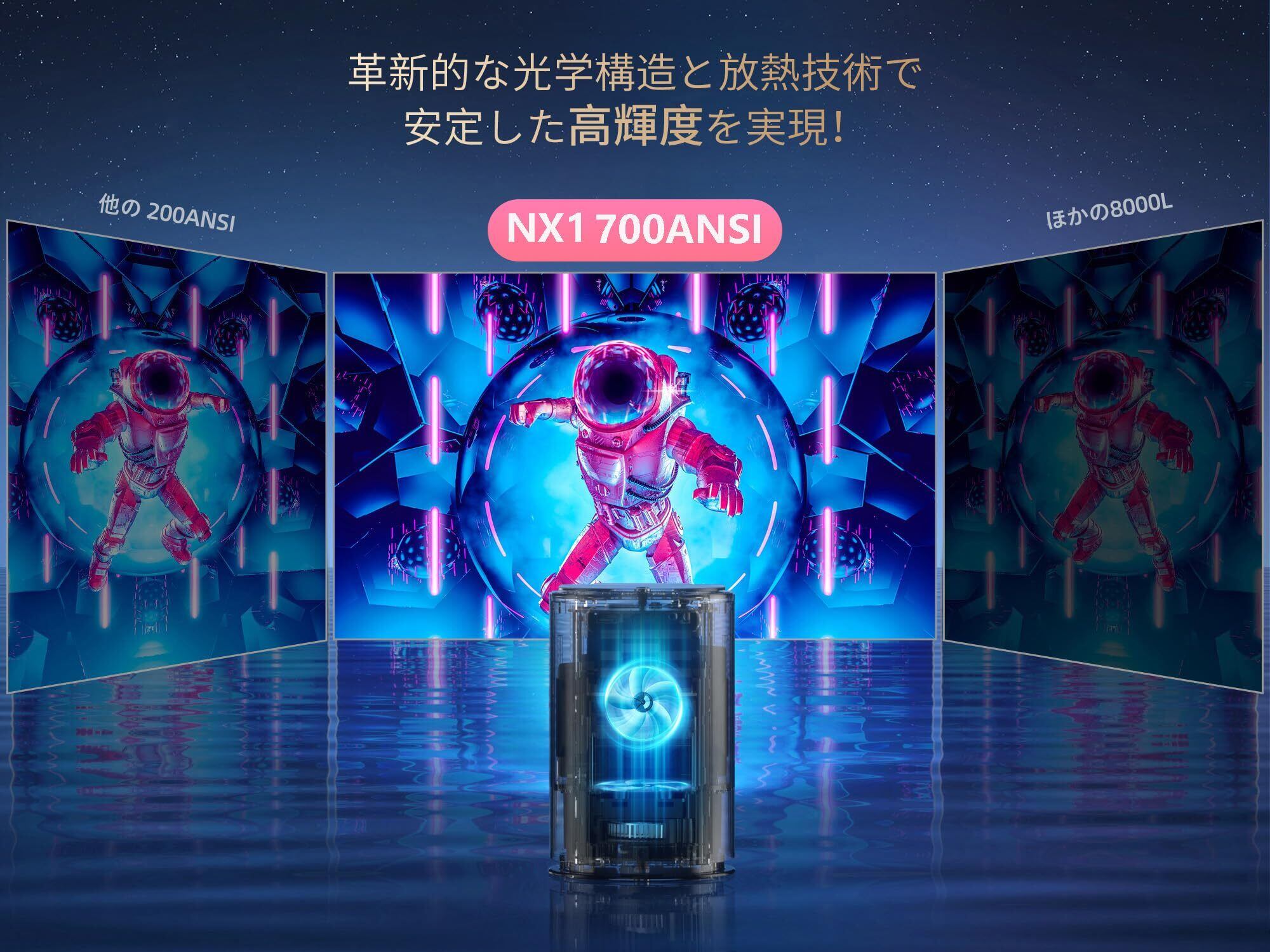 ①【0.1秒瞬間補正×700ANSI高輝度|年末年始を鮮やかに彩る】 NX1PROは、傾きを検知して映像の歪みを直す「自動台形補正」と、リモコン操作の「電動フォーカス」を搭載。面倒な手動ダイヤル調整から解放され、誰でも簡単に、数秒で綺麗な長方形画面に調整できます。あえてOSを非搭載にしてコストをかけたクラス最強級700ANSIの高輝度も魅力。機械が苦手な方でも、クリスマスの映画や正月の特番を「電源ONですぐ」快適に楽しめます。