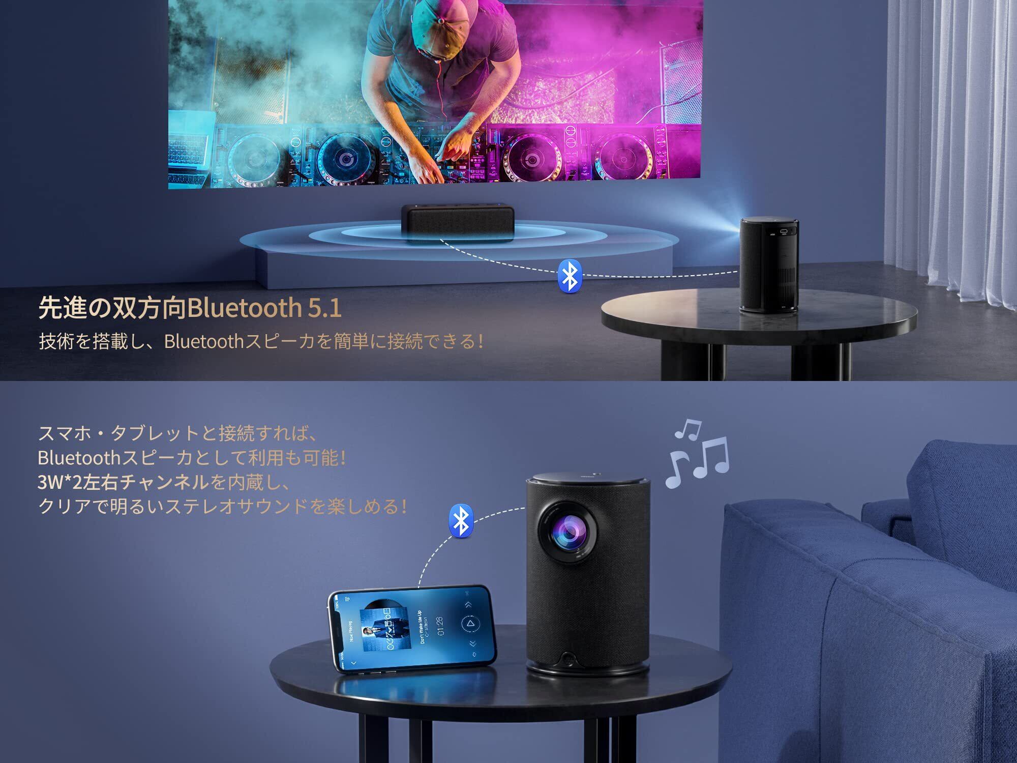 ④【双方向Bluetooth5.4×静音設計|パーティーからリラックスまで】 高音質スピーカー内蔵で、スマホと接続してBluetoothスピーカーとしても使用可能。クリスマスパーティーのBGMを流したり、親戚が集まる正月のゲーム大会でSwitch/PS5を大画面でプレイしたりと大活躍。35dB以下の静音設計なので、静かな冬の夜長もファンの音を気にせず没入できます。