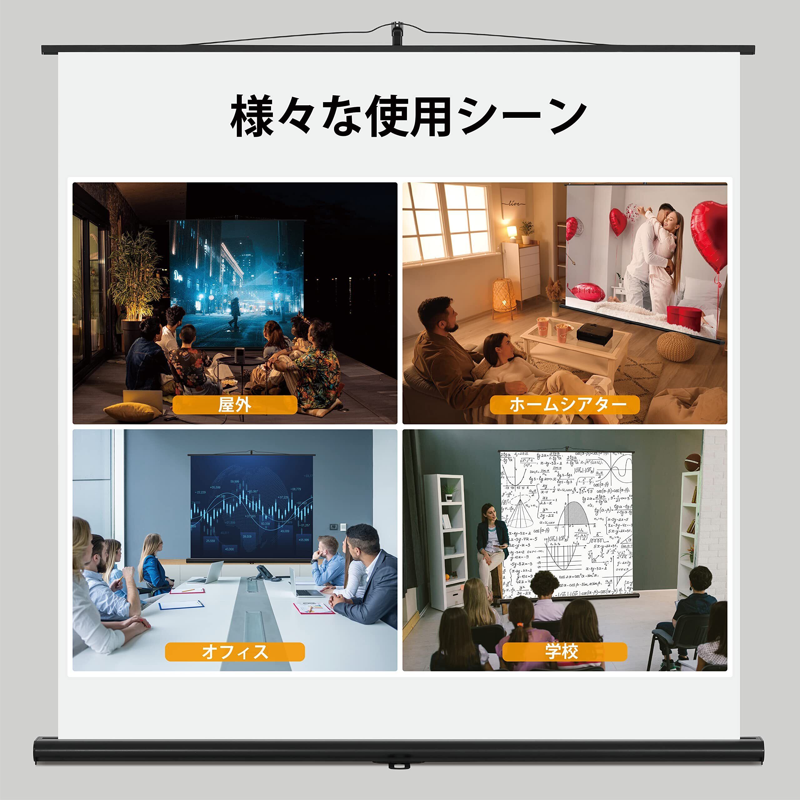 プロジェクター スクリーン、引き上げ式、スクリーン プロジェクター用、自立式 携帯型、サイズは81.3インチ16:9、88.5インチ4:3から100インチ1:1まで、4K対応、軽量でコンパクト、保管と持ち運びが簡単、家庭用シアター、オフィス、学校、屋内・屋外での映画鑑賞に最適。