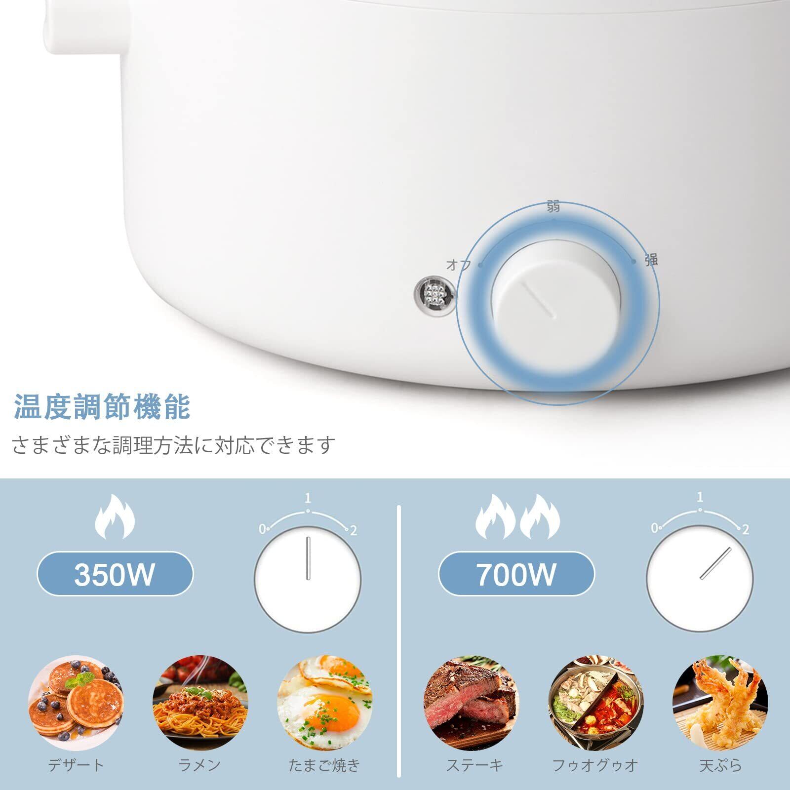 【多機能電気鍋】温度調節機能が備えておりますから、あなたは自分のニーズに応じて、最適なモード(350W /750W)をお選びいただけます。低電力モード(350W)では、ラーメン、たまご焼き、パンケーキを調理できます。また、ステーキ、フゥオグゥオ、すき焼き、炒め物を調理する際にはハイパワーモード(750W)を切り替えばいいです。このolayks電気フライパンは従来のストーブキッチン用品に取って代わり、さまざまな調理方法に対応できます。