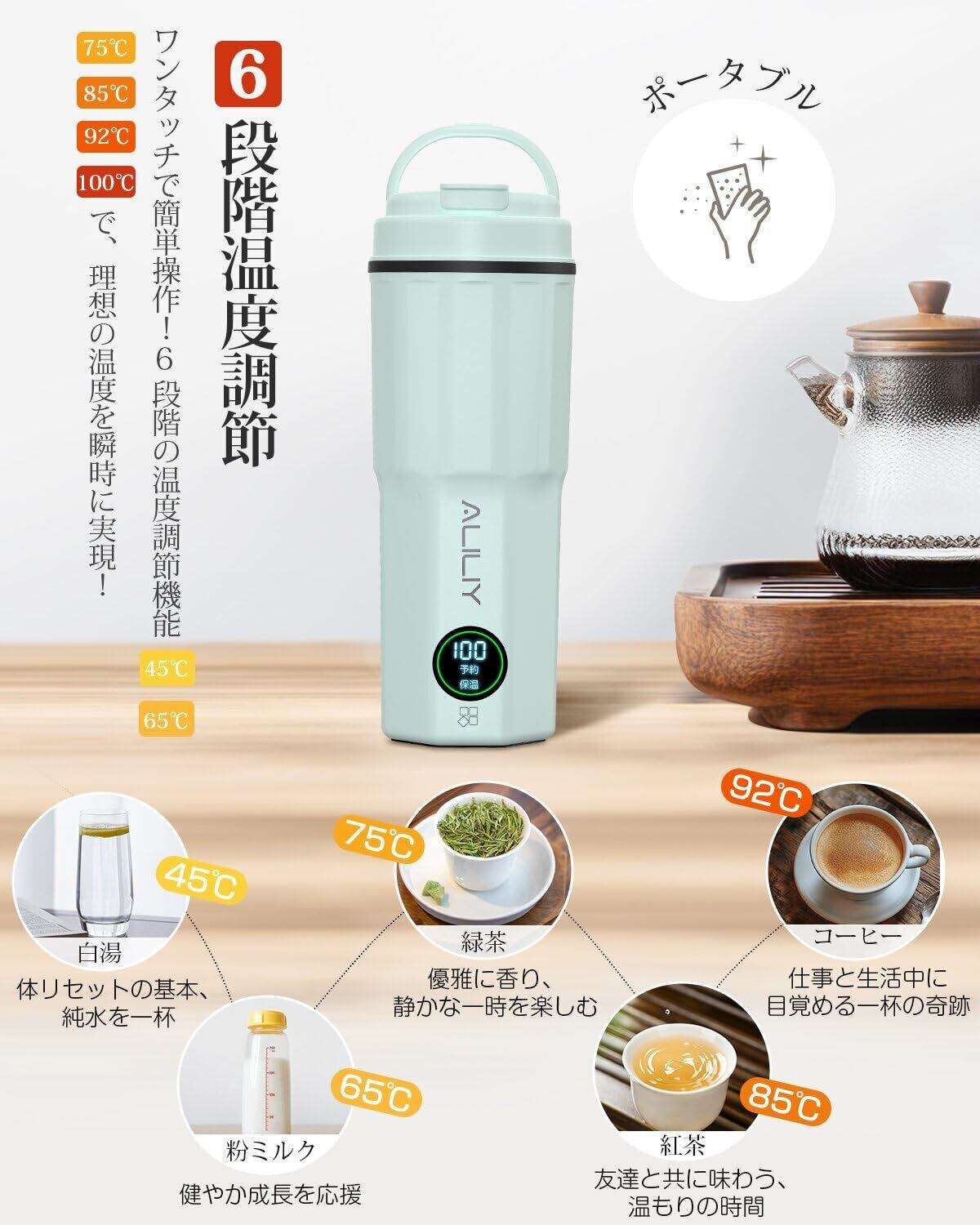 【6段階温度調節&長時間保温で快適】ALILIYポータブル電気ケトルは、精密な温度センサーを搭載し、45℃・65℃・75℃・85℃・92℃・100℃の6段階温度調節が可能。コーヒーや紅茶はもちろん、粉ミルクやインスタント食品など、飲み物や用途に応じた最適な温度でお湯を用意できます。長時間保温機能を備えており、いつでも温かい飲み物を楽しめます。朝にセットすれば、お昼や夕方も快適に使用可能。寒い季節の外出先でも、すぐに温かいお湯が手に入るので安心です。*電源を入れたままにすると、保温状態が続きます。