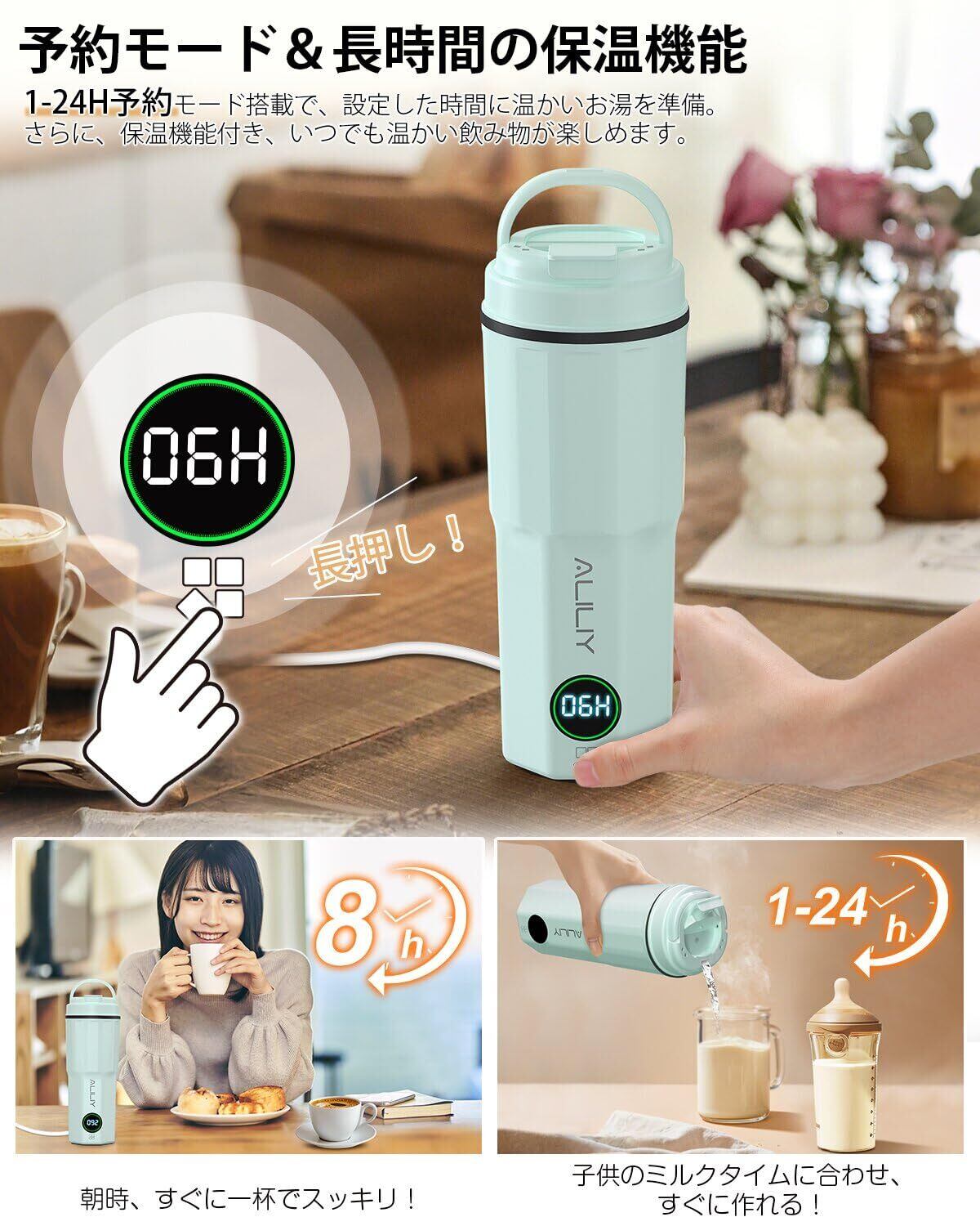 【1〜24時間予約設定で、いつでも理想のお湯】忙しい朝や仕事の合間でも、お湯を沸かす手間を省いてすぐに飲めるのが予約機能の魅力。1〜24時間の細かいタイマー設定が可能なので、就寝前にセットすれば、翌朝すぐに白湯やコーヒーを楽しめます。オフィスや育児シーンでも大活躍!必要な時にちょうどいい温度のお湯を用意できる便利でスマートなポータブル電気ケトル。*電源コードが必要。
