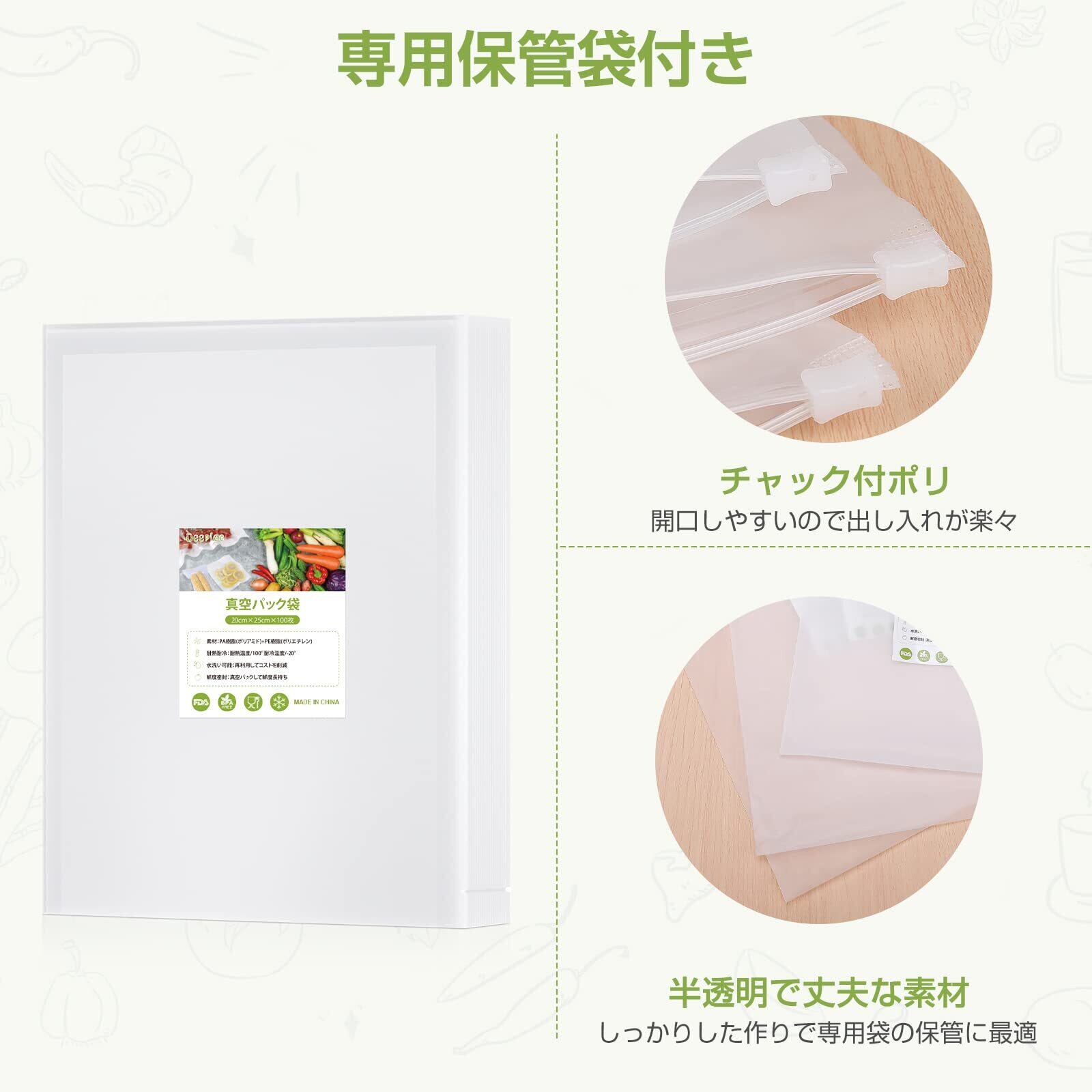 【使い勝手】空気を抜きとることによって食品の酸化、腐敗を抑制します。手触りがよく、内容物を潰さずに綺麗に真空パックすることができます。真空で鮮度密封、鮮度長持ち、冷蔵・冷凍庫をスッキリ収納できます。ご家庭では、たくさん作って冷凍保存・防災用品の保存に使い便利です。また、料理店・レストラン・ホテルの厨房・精肉店・寿司店・鮮魚店・冷凍食品製造業者・和洋菓子店など、様々な場所に適用可能です。※文中の「真空」は完全な真空状態のことではありません。JIS規格における「大気圧より低い圧力の気体で満たされた空間内の状態」を指します。