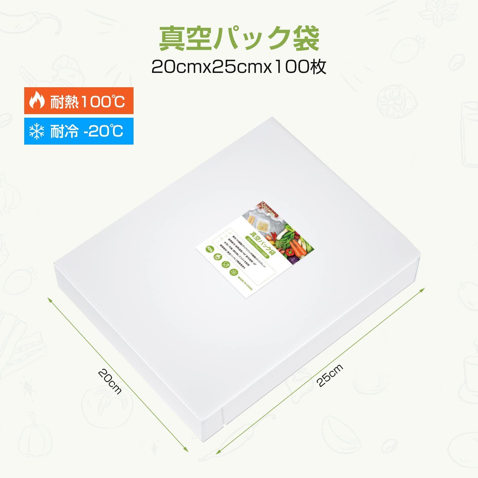 【商品仕様】サイズ:20cm×25cm×100枚 重さ:約920g 耐熱温度:100° 耐冷温度:-20°。100枚入り、お気軽にお使いいただけ、コストを最大限に下げられます!8層構造のフィルムで、密閉性が高いです。袋厚は90μmあるため、破れに強いという特徴があります。通常保存よりも雑菌の増殖を約1/50に抑えるから、食品の鮮度が長持ち可能です。