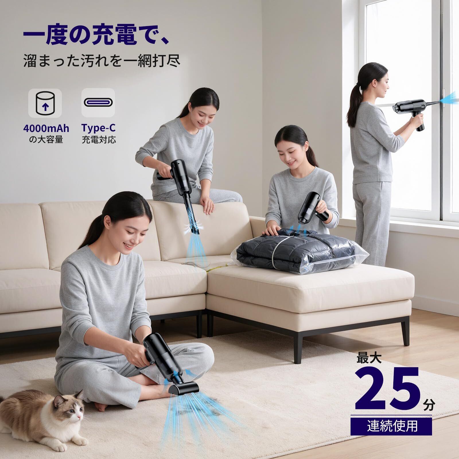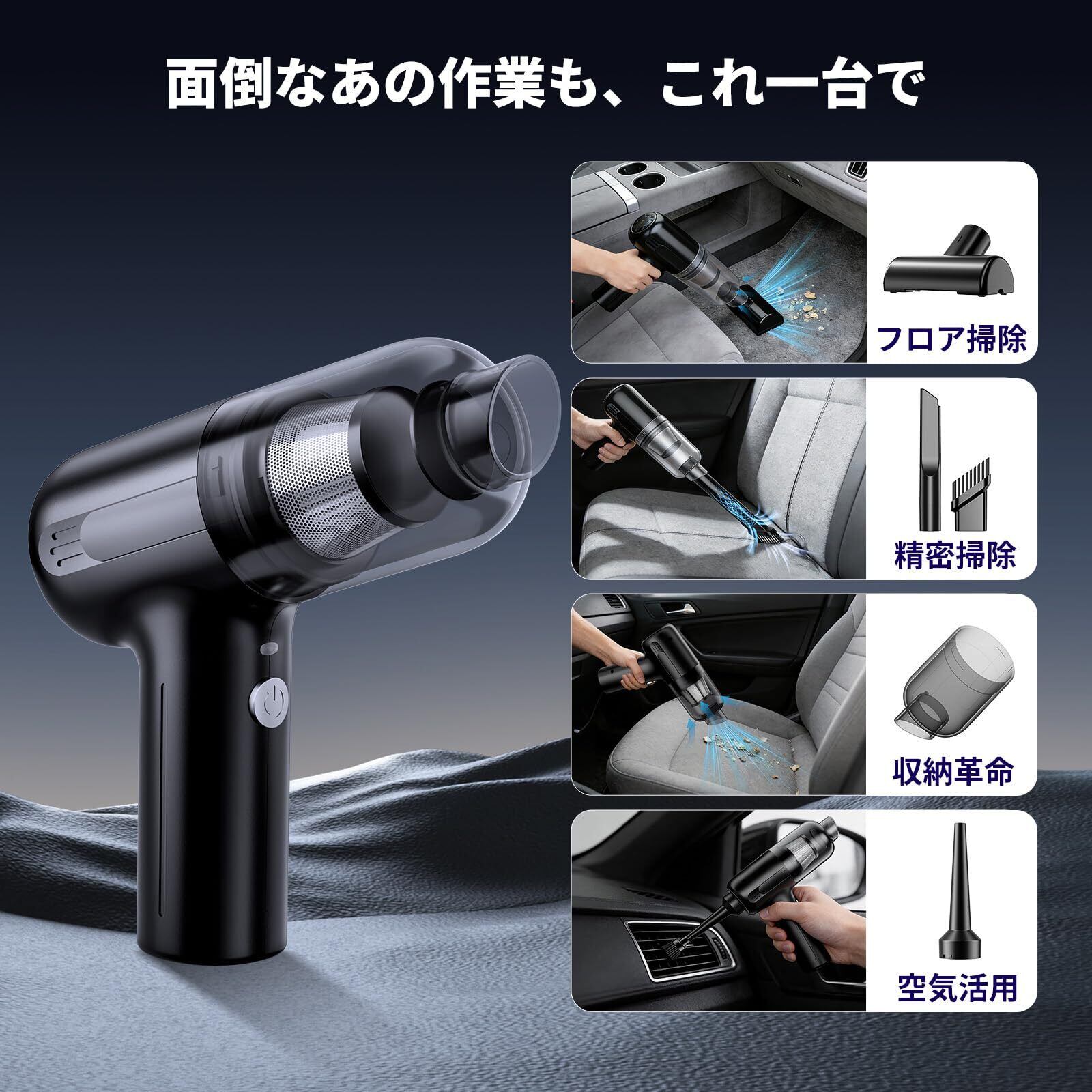 【業界初、4in1マルチ機能で生活を全制圧】吸引・吹き飛ばし・空気入れ・空気抜きの4機能を一台に集約した、真の4in1 コードレス掃除機。キーボード クリーナーとしても卓上 クリーナーとしても、ほこりを吹き飛ばし精密清掃を実現。車内 清掃はもちろん、アウトドア用具の充填や布団の圧縮収納まで対応。車 クリーナーとしても、家庭用小型掃除機としても、あらゆるシーンをカバーする便利 グッズです。