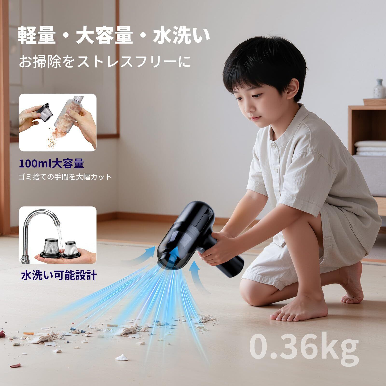 【革命的な軽さと、プロ級の高出力】このコードレス クリーナーは、わずか362gの超軽量設計。ハンディ掃除機でありながら、90,000rpmの高出力モーターと25,000Paの強力吸引を実現。畳の奥の微細なホコリからペットの毛まで一掃する小型 掃除機です。軽々と片手操作でき、女性やご年配の方にも最適な充電式 掃除機です。