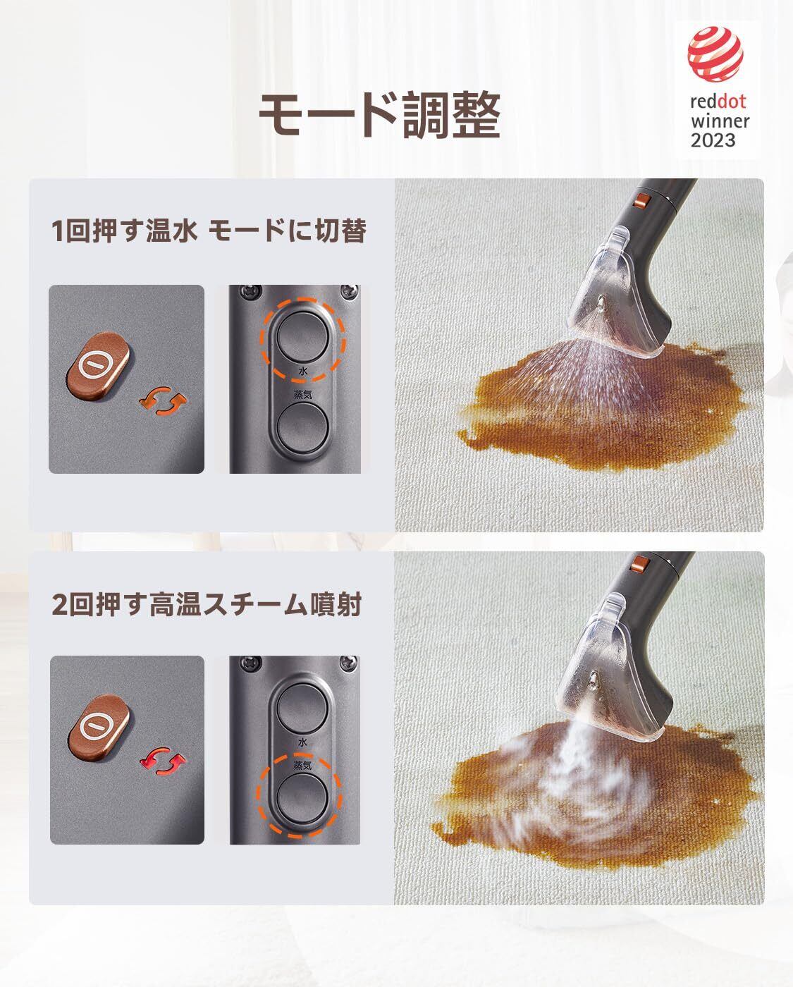 【60℃温水洗浄+100℃高温スチームで、落ちにくい汚れも根本から分解】uwant スチームクリーナーは、普段のお手入れに最適な60℃温水モードと、繊維の奥に入り込んだ頑固な汚れを強力に分解する100℃スチームモードを搭載。飲みこぼしによるシミ、汗汚れ、油汚れ、ペットの粗相跡など、水だけでは落ちにくい汚れもしっかり浮かせて除去します。さらに高温スチームは、ニオイの元や雑菌にもアプローチできるため、清潔さを重視するご家庭でも安心。ソファ、カーペット、マットレス、車内シートなど、さまざまな布製品を素材を傷めずにスッキリ洗浄し、従来のクリーナーでは物足りなかった“深部汚れ”までケアできます。毎日の軽い汚れからガンコなシミまで、一台でプロ級のクリーニング体験を実現します。