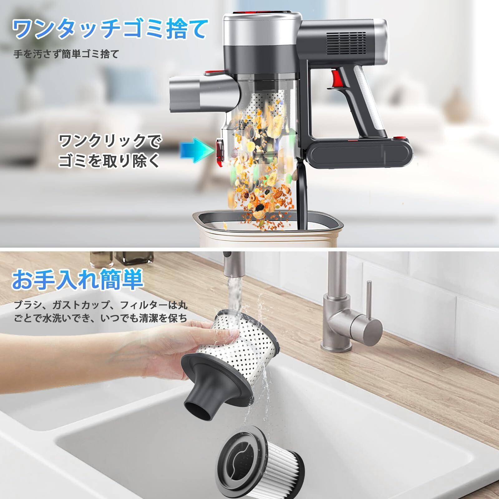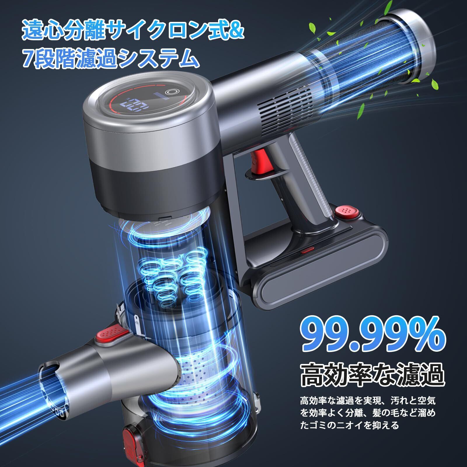【7重濾過システム&1L大容量&お手入れ簡単】Bivark掃除機コードレスは7層強力濾過サイクロンシステムを採用して、遠心力で「ゴミ」と「空気」をすばやく分離できて、強力吸引力を持続でき、長時間の連続使用でも安定した性能を発揮します。サイクロン除塵技術と高性能HEPAフィルターシステムと組み合わて、微細なゴミ·ほこりを取り除き、排気もクリーンに。0.3ミクロンの微細なホコリを99.99%捕らえ、部屋の空気よりもきれいな空気を排出。ペットや小さなお子さまにも安心。人体にも環境にも優しいサイクロン掃除機です。そして、掃除機は大容量の1L大容量ダストカップを持っていて、ダストカップにたまったゴミはワンタッチでゴミ捨てられ、手も汚れず衛生的です。さらに汚れが気になる場合は、ダストカップは取り外して分解でき、丸ごと水洗いOK!細かい部分に付着した汚れを洗い流せるので、常に清潔な状態を保てることができます。定期的に洗うことで、吸引力も持続します。