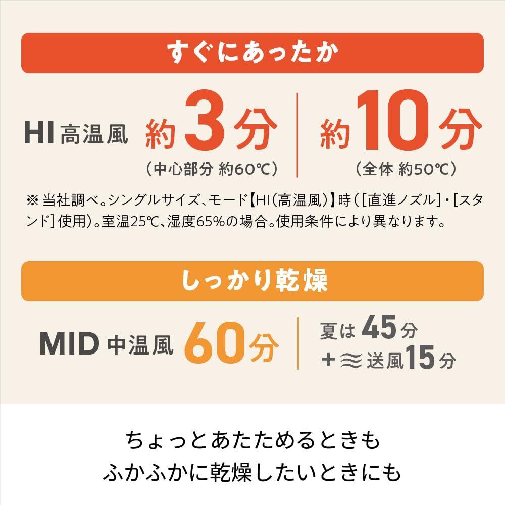 [すみずみまでしっかり乾燥&あたため] 「ブラシレスDCモーター」の採用で、小型化に加えてハイスピードなあたためを実現。 レコルト独自の吹出口形状”HOTスクエア”でふとんをすみずみまでふんわりカラッと乾燥できます。足元のあたためなどは約3分で。就寝前のちょっとした時間でも使えて重宝します。気になるダニ対策などにも。