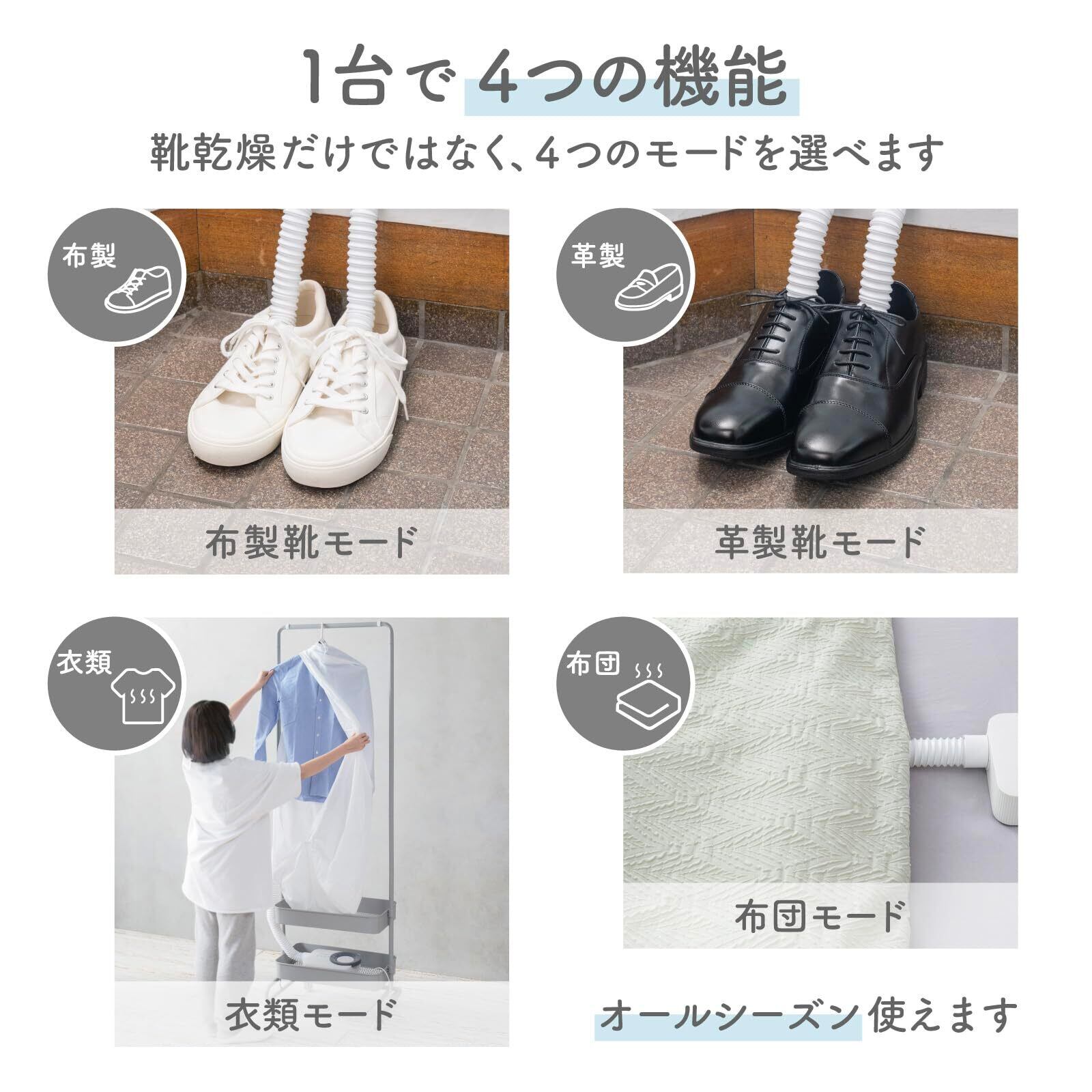 特長4:1台で4つのモードを選べます。(布製靴モード、 革製靴モード、衣類モード、布団モード)