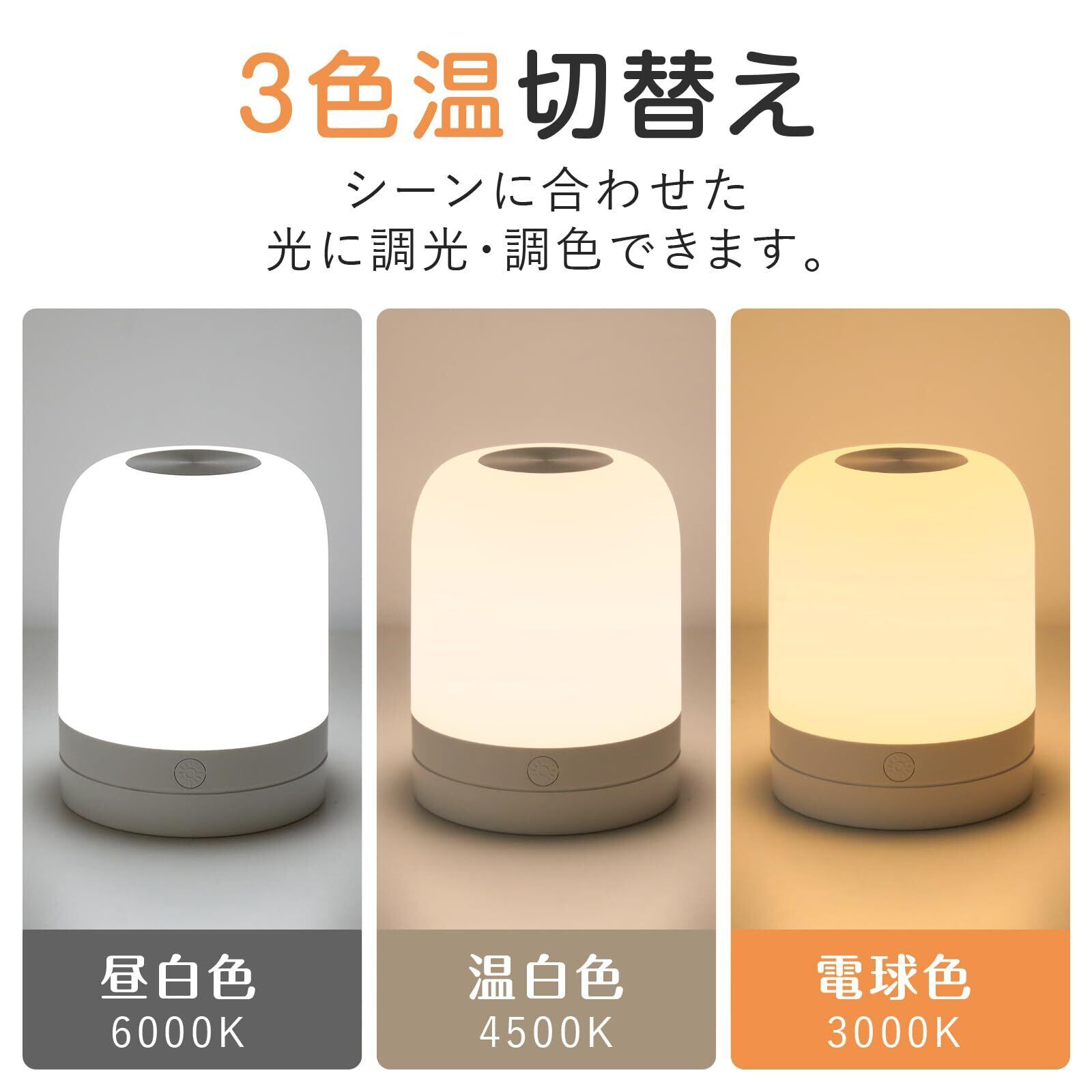 【3色切替可能・無段階調光】本体の上部を1回押すと電源on/off、2回押すと電球色・温白色・昼白色が切り替えことができます。暖色系の光は目にやさしくて、夜間授乳やオムツ替えの時に最適なライトです。タッチセンサーを長押して無段階調光でき、読書を楽しむときは、問題なく文字を読む明るさに調整し、就寝時に点灯したままの場合は、睡眠時の気にならない明るさに調節します。