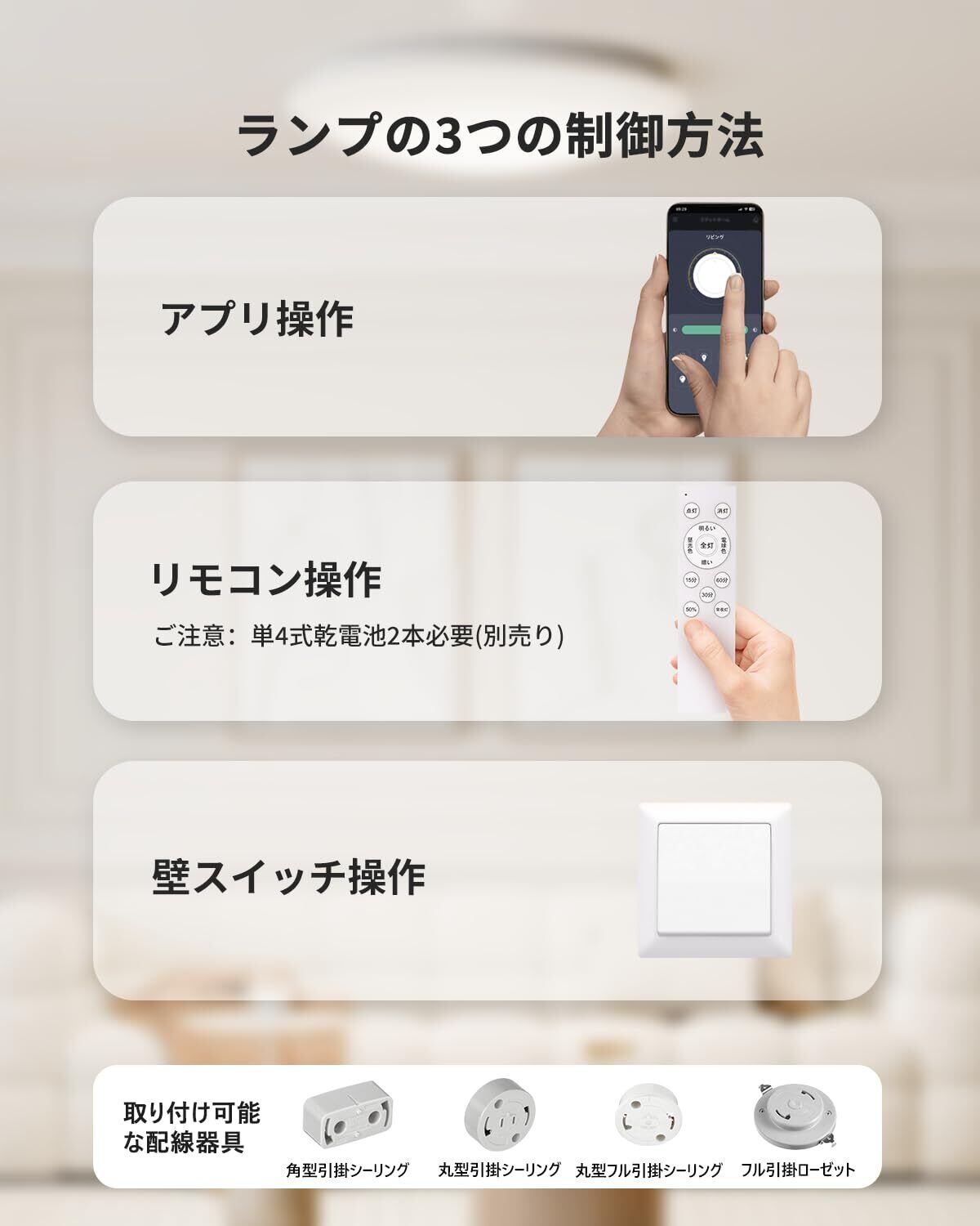 【3つの操作方法に対応】 本製品は、リモコン・スマートフォン・壁スイッチの3つの操作方法に対応し、便利に照明をコントロールできます。アプリでは調光・調色・タイマー設定などを自由に調整可能。LEDライトの使い勝手を最大限に引き出せます。壁スイッチ操作では、素早く切り替えると昼白色 → 昼光色 → 電球色 → 常夜灯の順で切替可能です。