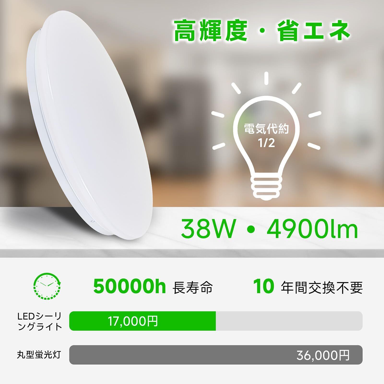 LEDシーリングライト 8畳~10畳(38W) 4900LM 天井照明器具 おしゃれ 蛍光灯 調色/調光タイプ 昼光色 電球色 リモコン付き 調光タイプ LEDライト 豆電球常夜灯モード メモリ機能 30分/60分スリープタイマー 玄関 寝室 和室 台所 洗面所