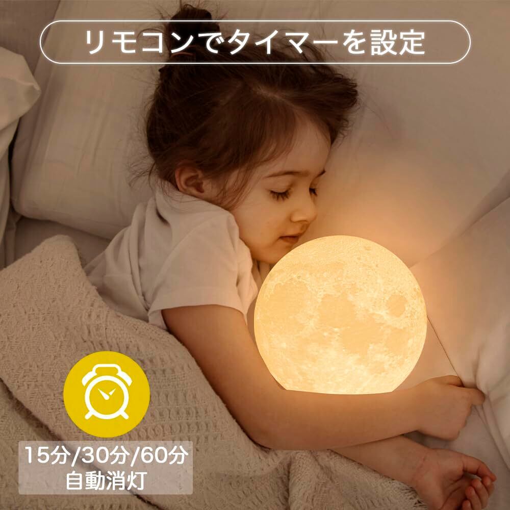 【タイマー機能付き・無段階調光】リモコンでタイマーを設定して、月ランプが15分/30分/60分に自動消灯できる。リモコンを使用とも、タッチボタンを長押しとも、明るさを無段階に調整可能。周囲の明るさに応じ て変更ができ、光のムダがなし。