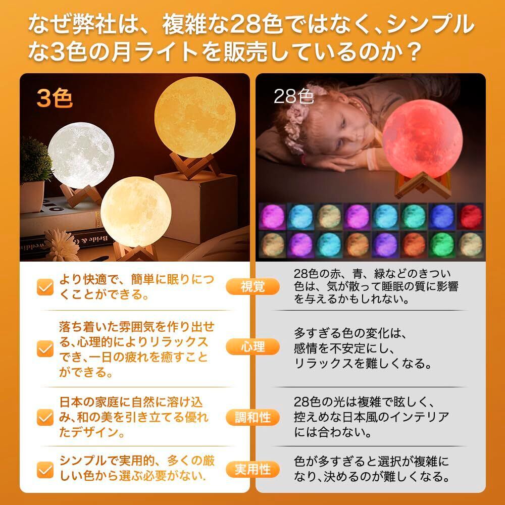 【2023.6.16から進化版・2色を3色に変更】昼白色・温白色・電球色・3色をゆっくり点滅、四つのモードある。暗闇の中でもっと月のような光がよく見える。(外光が強い場合はあまり目立たない場合があります)。充電中に、電流は0.2Aのみ(人体が耐えられる安全な電流レベルをはるかに下回るものです),スイッチのボタンをタッチして絶対に安全です。心配しないでください。