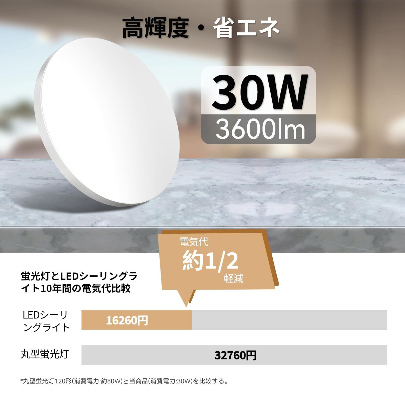 【省エネ、高輝度 、高い演色性】①当社のLEDシーリングライトは、高効率なLEDレンズを採用し、30Wの低電力で3900lmの明るさを実現します。明るさは蛍光灯の2倍、電気代は約半分を節約でき、6~8畳の部屋全体を均一に照らします。②演色性Ra>85、自然光に近い光が物に照射、物の色がもっと自然に見えます。CO2削減にも多く貢献し、環境に優しいです。