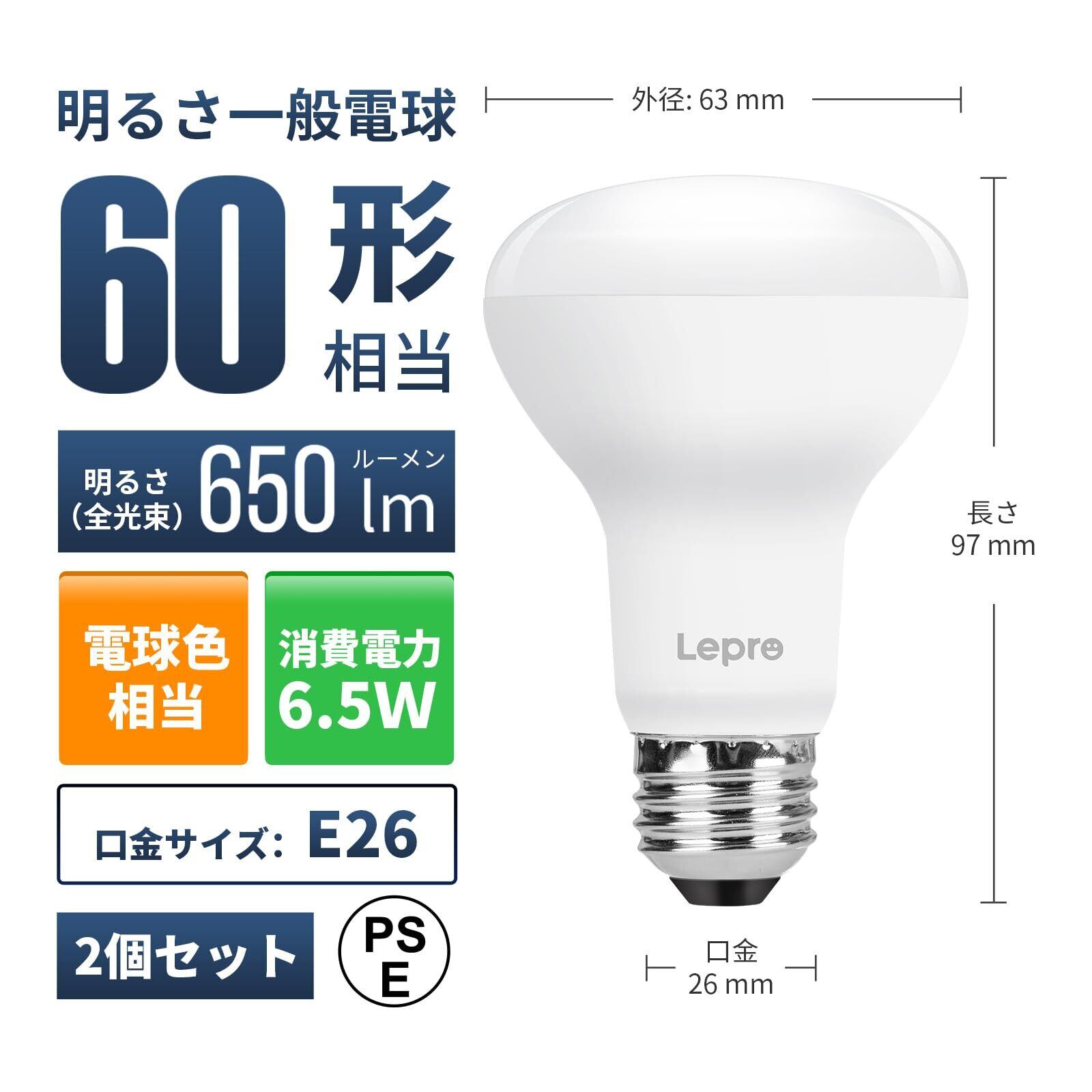 Lepro LED電球 E26口金 レフランプ形 非調光型 60W形相当 6.5W 電球色 650lm レフタイプ 広配光タイプ 高演色性 PSE認証済み 密閉器具対応 省エネ キッチン 台所 トイレ リビング ダイニング 脱衣所 寝室 廊下 玄関照明用 レフ電球 2個入り