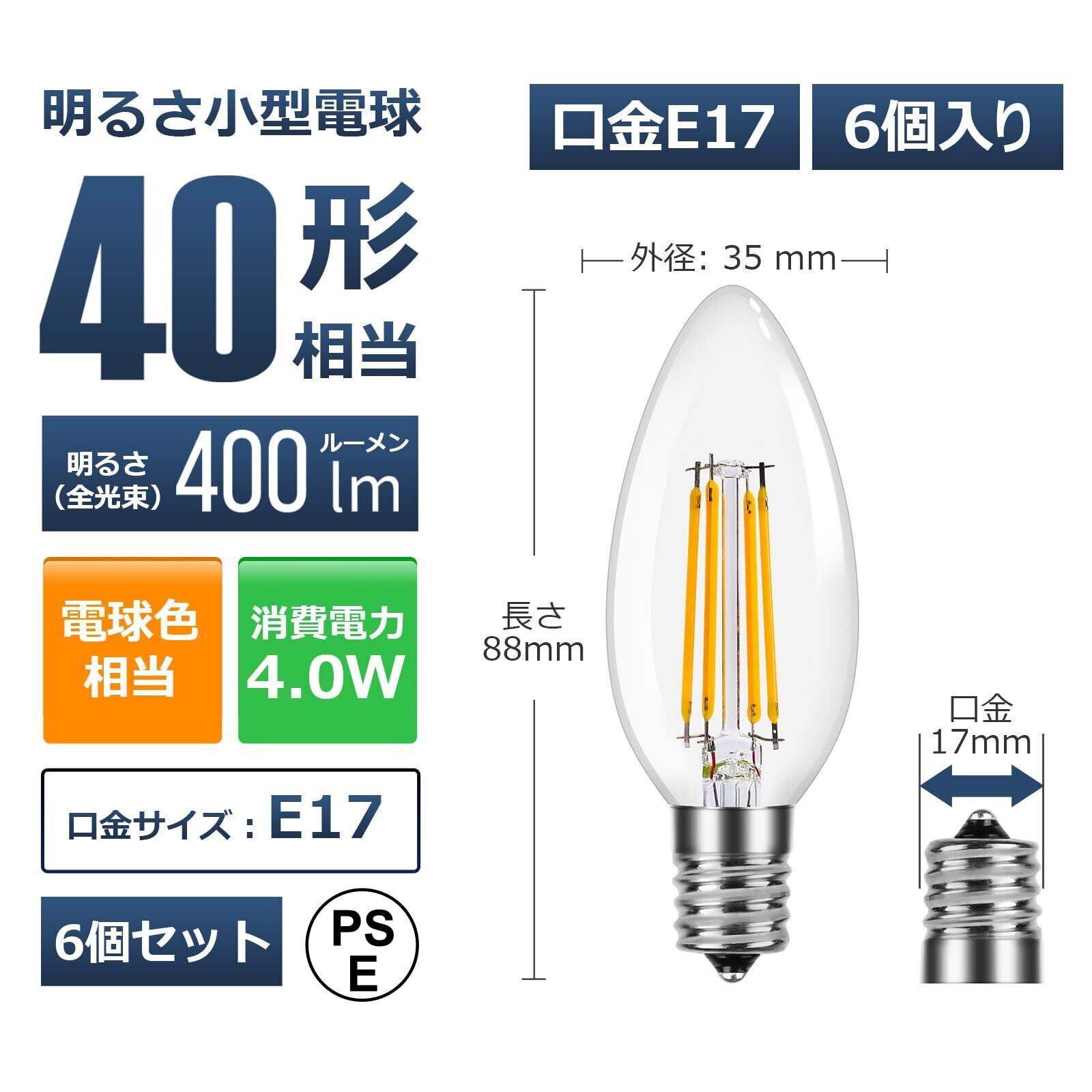 Lepro LED電球 E17 全方向 40W形相当 電球色 シャンデリア電球 6個パック 非調光型 口金直径17mm C35 フィラメント 高演色性 クリアタイプ 密閉器具対応 4W 省エネ シャンデリア風 蝋燭型 レトロ キャンドル led照明 日本PSE認証済