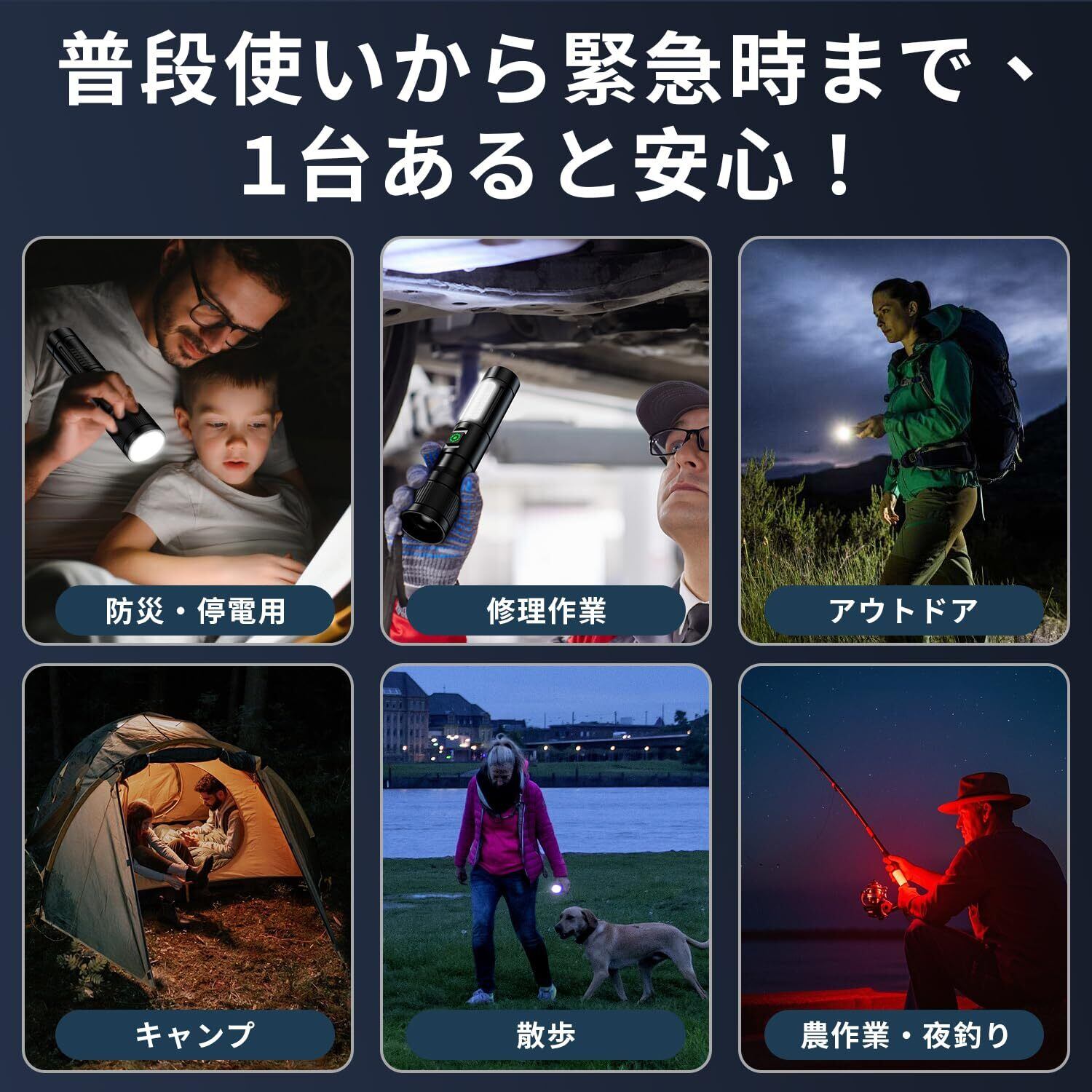 【高強度LED照明で&作業用COBライト&6つの多機能点灯モード】この懐中電灯は,高輝度の LEDを搭載し、最大1000ルーメンの明るさを実現、最大照射距離は500メートルに達します、投射された光束の明るさは完全に同じタイプの懐中電灯を超えて、緊急時にはCOB赤灯の点滅でSOS信号として使用でき、安全性を向上させます。懐中電灯のヘッドを伸縮させることで焦点距離を調整し、遠距離スポットライトまたは広範囲の汎光灯を自由に選択することが可能です。