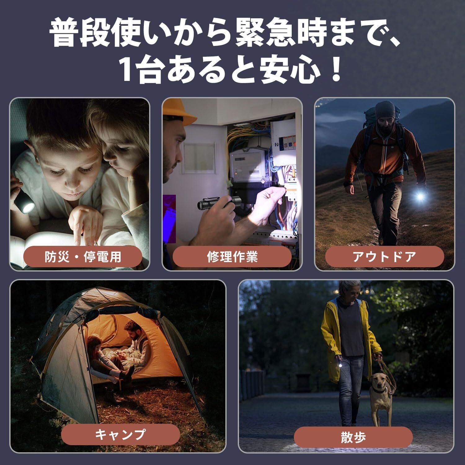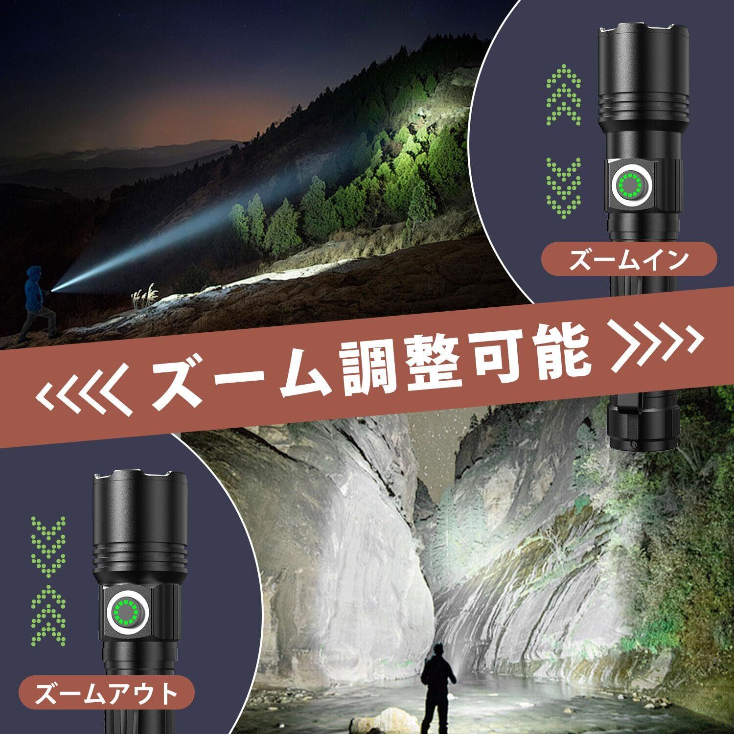 【5種類の照明モード& ズーム機能】この懐中電灯は、5種類の照明モード(高輝度-中輝度、低輝度、SOS、点滅)を備えており、スイッチを押すだけで順番に切り替えられます。どのモードでも、スイッチを長押し3秒で消灯できます。さらに、強化されたズーム機能により、より遠くまで照射できるだけでなく、広範囲をカバーすることも可能で、アウトドアや防災、日常使いなどさまざまなシーンで活躍します。