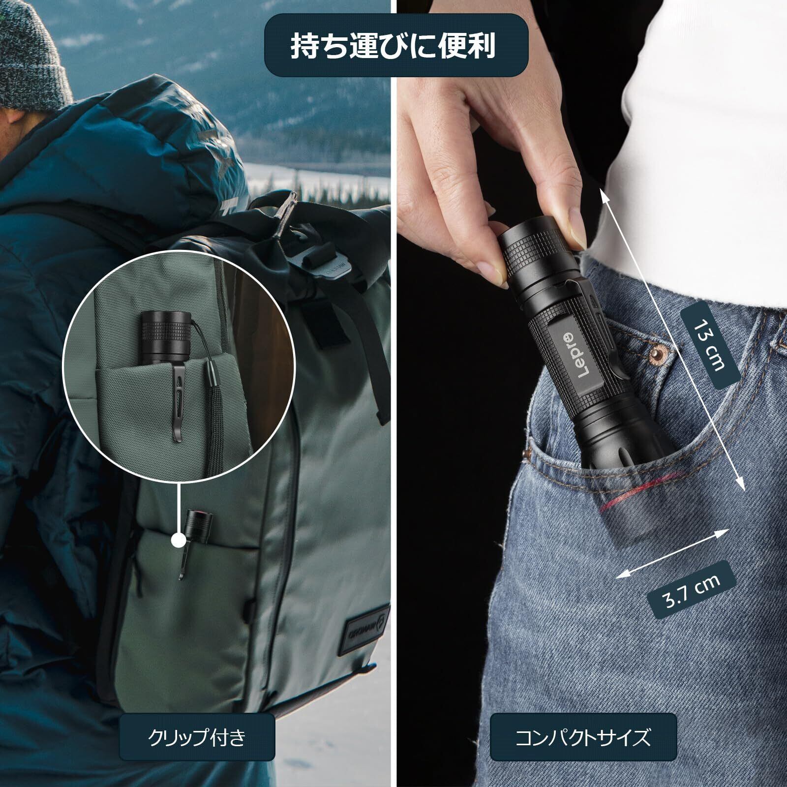 【クリップ付き・高耐久性】本懐中電灯は軍用超高硬度のアルミ合金を採用していますので、本体はとても頑丈で耐衝撃性に優れ、防災や護身用などに使用可能です。軽量かつコンパクトなサイズで、クリップやストラップも付属しているので、便利で高耐久性を備えています。夜間のペットの散歩、防犯監視、夜釣り、キャンプ、登山、アウトドア、停電時、非常灯など様々なシーンでご使用いただけます。