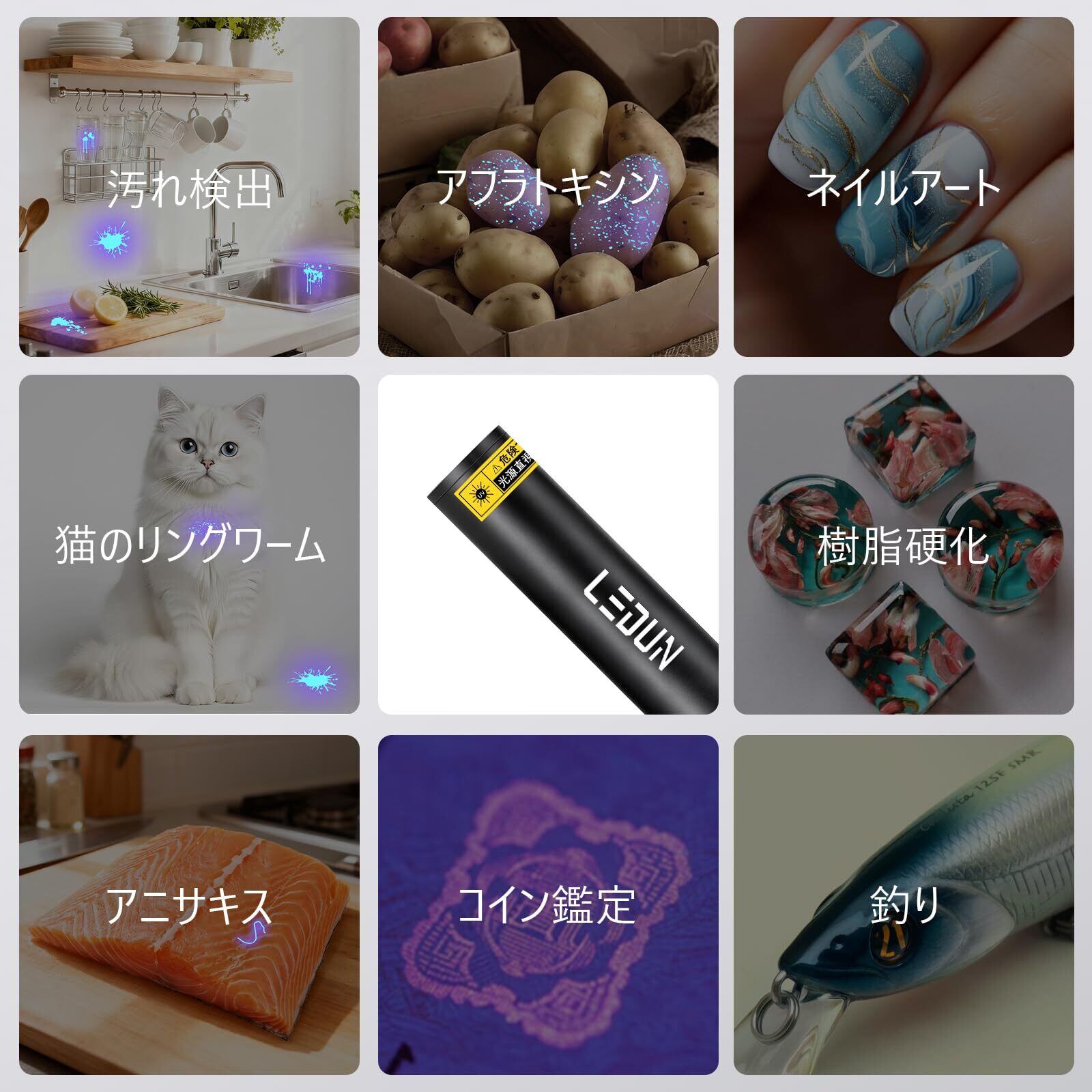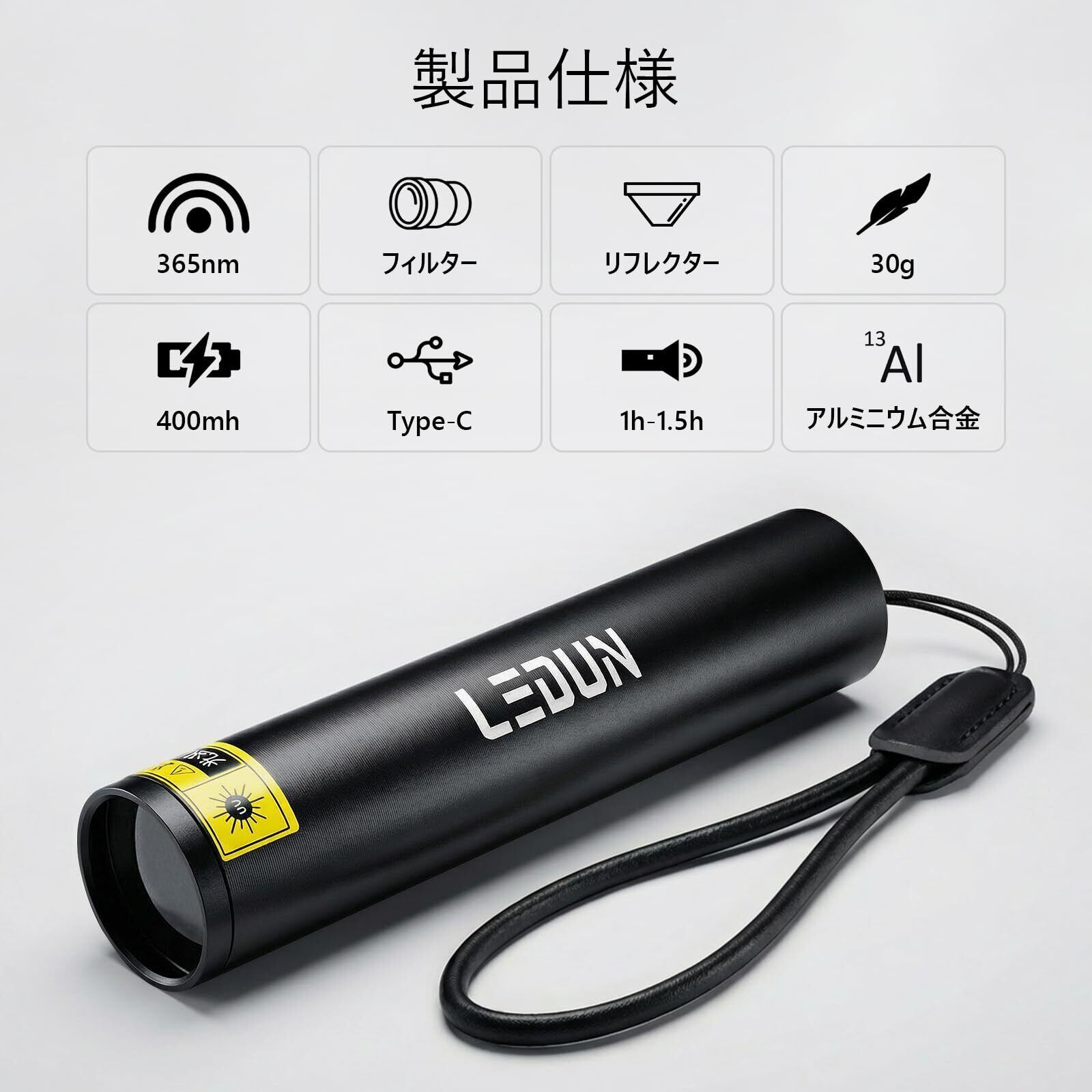 UVライト 波長365nm 紫外線 ブラックライト アニサキス 猫のリングワーム 家庭汚れの ペットの尿痕特定 樹脂硬化 蛍光増白剤確認用 鑑定 Type-C充電