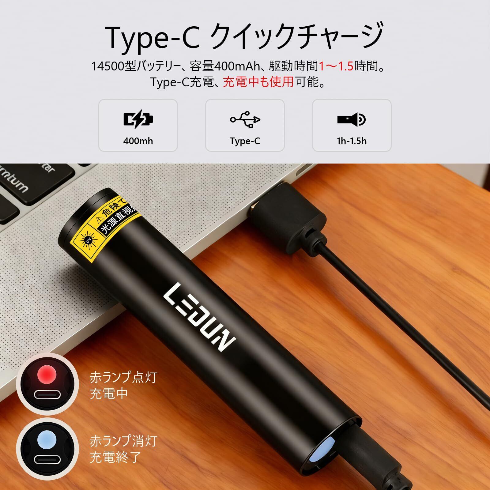 【途切れない長時間駆動】大容量400mAhバッテリーで最大1.5時間連続使用が可能。Type-C充電に対応し、充電中も作業を継続できます。