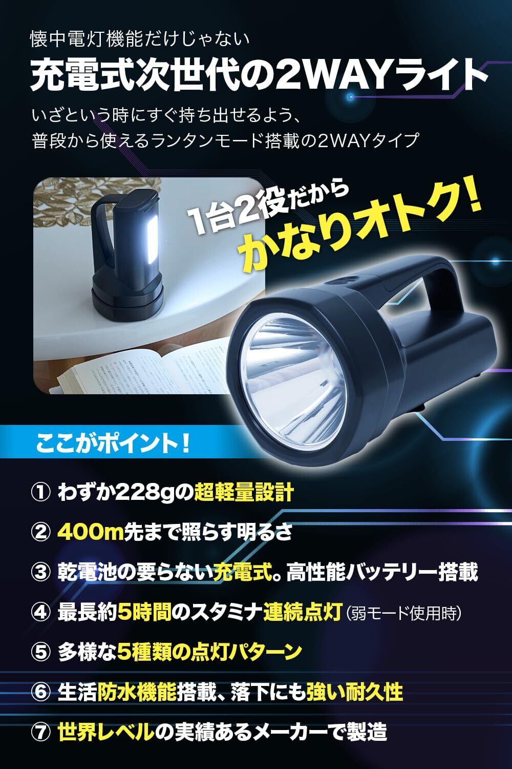 【ライトとしても大活躍】400m先まで照らす照射力× リモコン並の軽さ最長約400mのロングビームを実現。高輝度450ルーメンの光が、夜道や災害時の不安を解消します。さらに高性能バッテリーを内蔵することで乾電池を不要とし、わずか228gというテレビリモコンのような軽さを実現。誰でも片手でラクに扱えます。