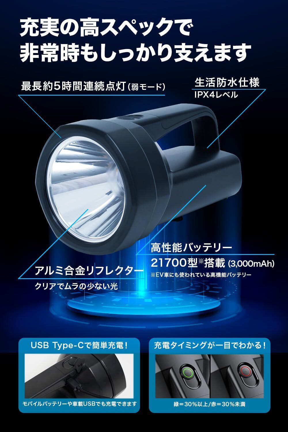 【もしもの時に支えになる防水・耐衝撃の頑丈設計】突然の雨や水しぶきの中でも安心して使えるIPX4の生活防水性能。ABSタフボディで被災時やアウトドアの衝撃にも対応。滑り止めグリップで濡れ手でも扱いやすく、登山・キャンプ・車内整備のようなハードな場面でも大活躍。