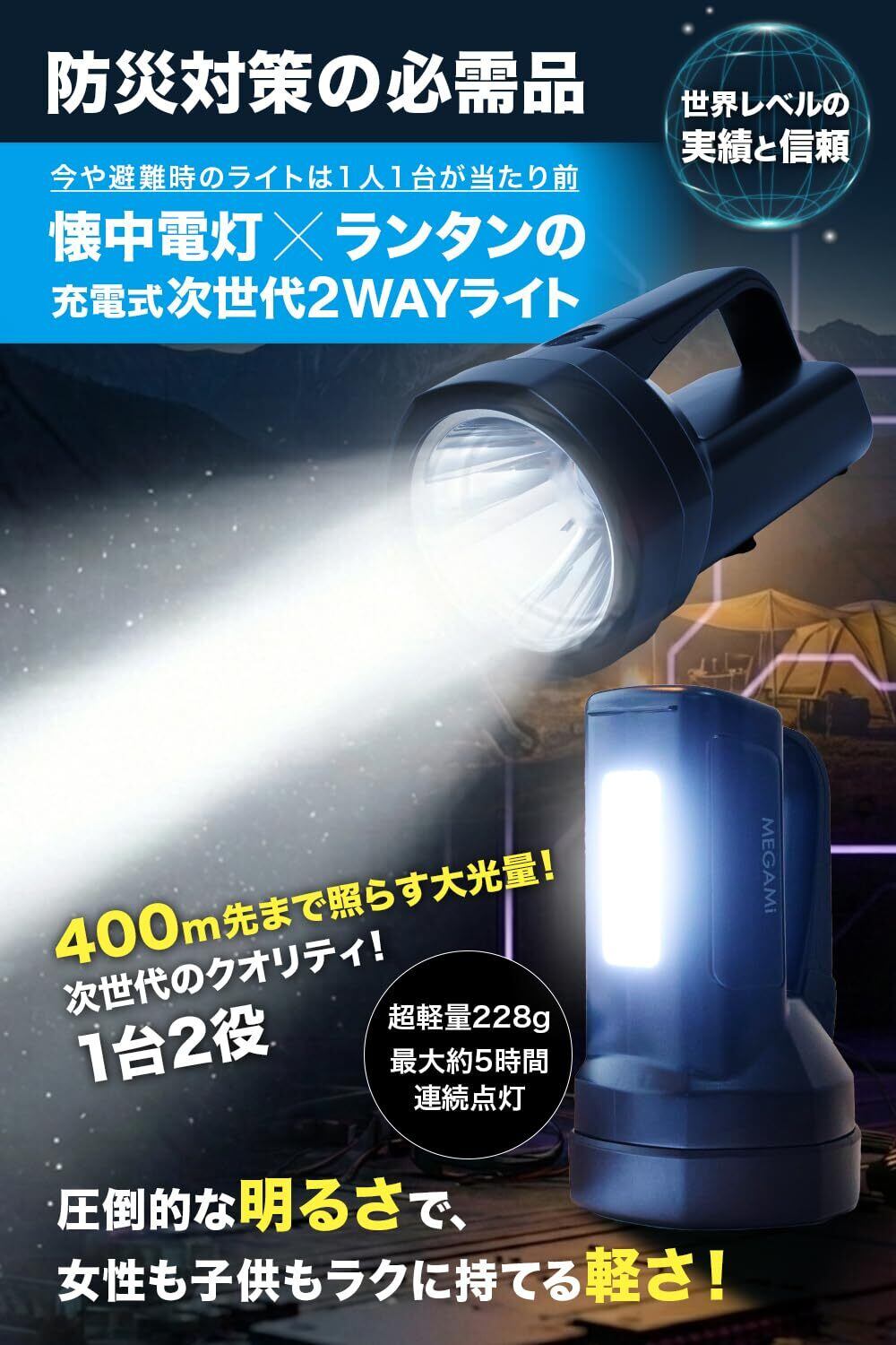 【1台2役・懐中電灯&ランタンの次世代式ライト】握ればパワフルな「懐中電灯」、置けばやさしく照らす「ランタン」。防災準備でかさばりがちなライトを1つにまとめて、コストも手間も解決します。懐中電灯としても、ランタンとしても、一切妥協しない高性能を実現しました。