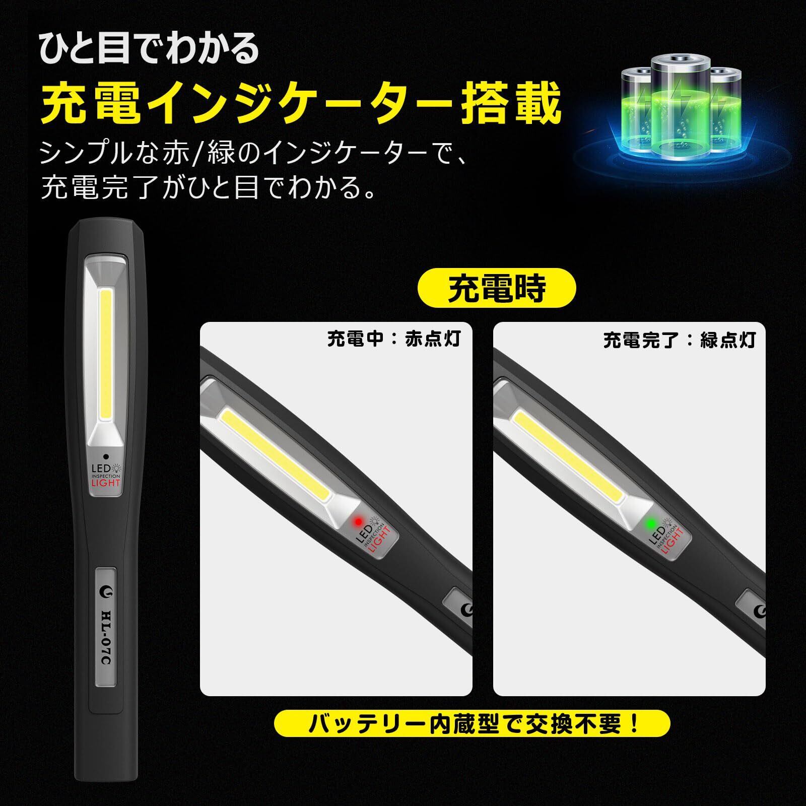 【仕様】ライト部位:サイドライト/ヘッドライト 全光束:150Lm/80Lm・ 使用チップ:COB/SMD・ 照射角度 :110°/45°・ 照射距離:約8m/約25m・ 点灯時間:約3時間/約5時間・ 発光色:昼光色(6500K)・ 点灯モード:2段階(ヘッドライト➡サイドライト➡オフ)・ 充電指示ランプ:充電中(0-99%):赤ランプ点灯/ 充電完了(100%):緑ランプ点灯・ 充電時間:2~2.5時間・ 入力電圧/電流:Type-C 5V/1A・ 使用電池 :内蔵型、3.7V 800mAH (Li-ion 14500型リチウムイオン電池)・ 防水等級:IP20(非防水)・ 耐衝撃等級:IK07・ マグネット:N35(ネオジム磁石)(クリップ)・ クリップ:あり・ 作業温度:-10℃~40℃・ サイズ:W166.1*H25*D26.3mm・ 本体質量:約61.4g・ 材質:PC・ セット内容:ライト本体、Type-Cケーブル、取扱説明書、書