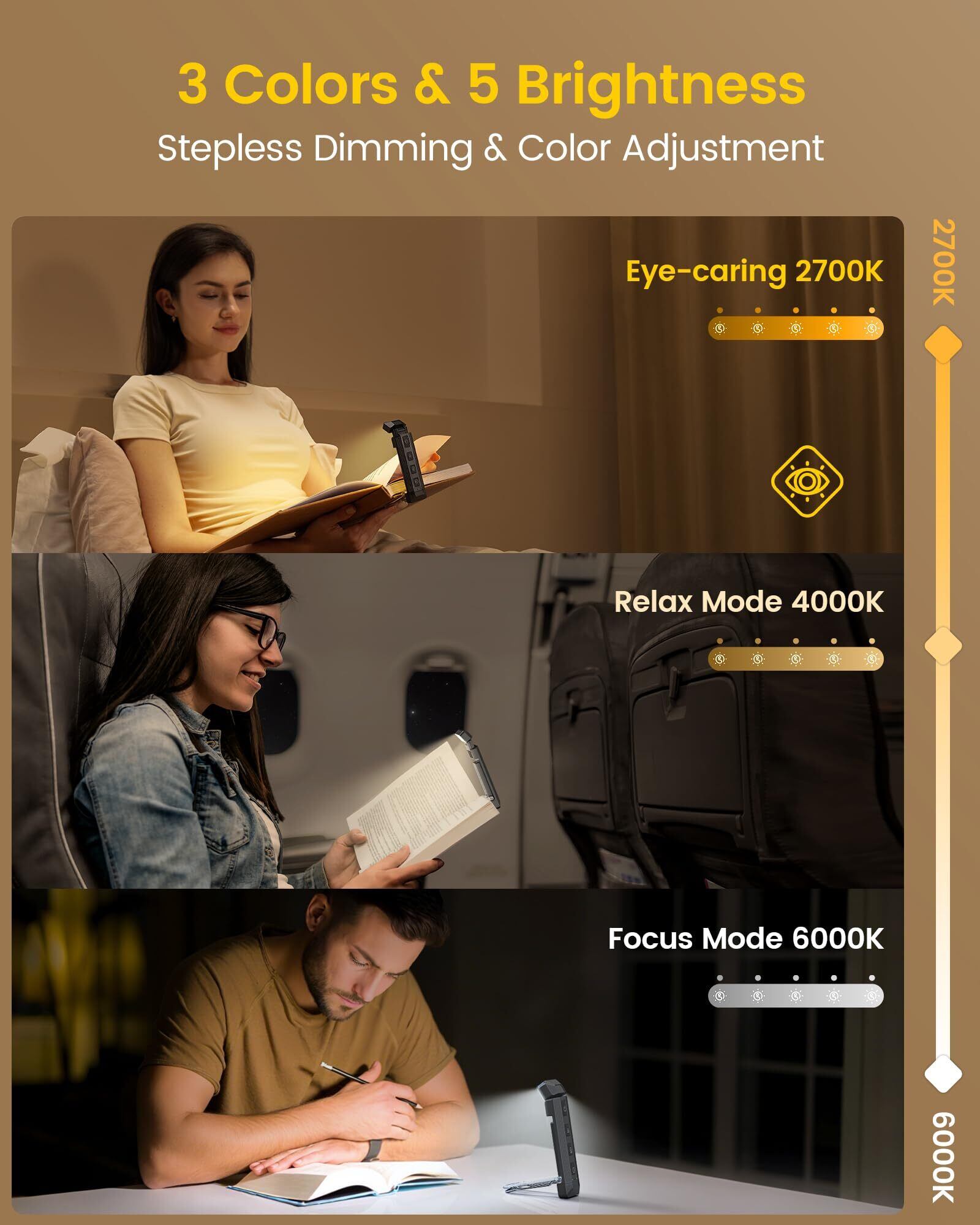 【3光色と5段階輝度調整】温かみのある居心地の良い照明を求めている場合でも、明るく集中したビームを求めている場合でも、ベッドでの読書ライトを使えば、3段階の色温度と5段階の輝度で、お好みの明るさに調節できます。温かみのある 2700K、汎用性の高い4000K、爽やかな6000Kの 3 つの色温度からお選びいただけます。無段階調整により、制限なくあらゆる状況に最適な照明を設定可能です。