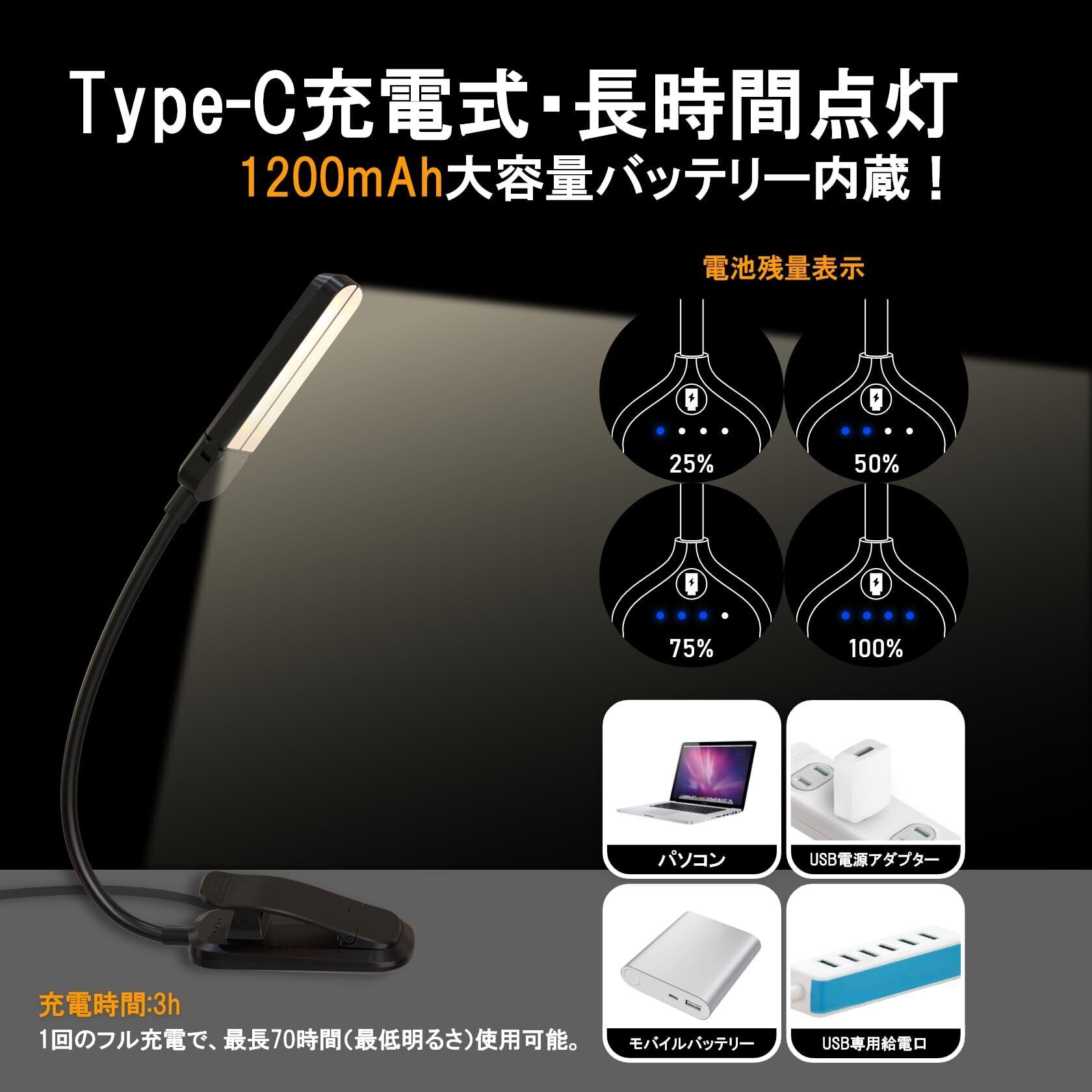 読書灯 ブックライト クリップ LED 目に優しい 3段階調色 無段階調光 USB充電式 ダブル光源照明 1200mAh 軽量 ポータブル 寝室 哺乳 読書 譜面台用 停電対応 ブラック